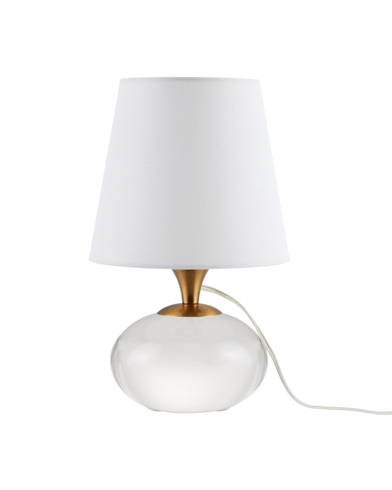 The Diantha Table Lamp is a magical composition, sitting atop an orb of carved and polished optic crystal. The antique brass metal that rises to disappear under the crisp white shade is a warm contrast, and the small scale makes this a wonderful choice for a mantle or a bookshelf.