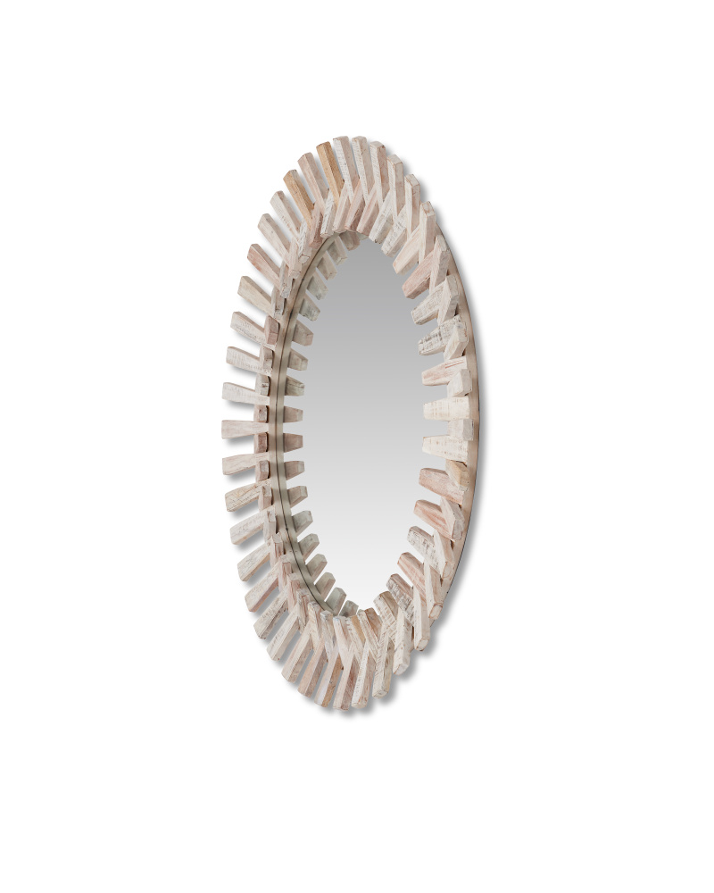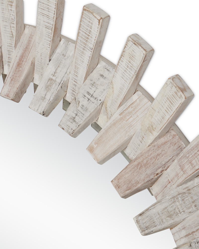 The Diza Round Whitewash Mirror has a profile that is just as interesting from the side as it is from the front. This is because the wood pieces, which taper and are fitted in by hand, splay outward on both the exterior and the interior of the white mirror. The depth this creates will make the decorative mirror a commanding element in a space. Both the woodgrain that shows through in spots and the shape are textural details.