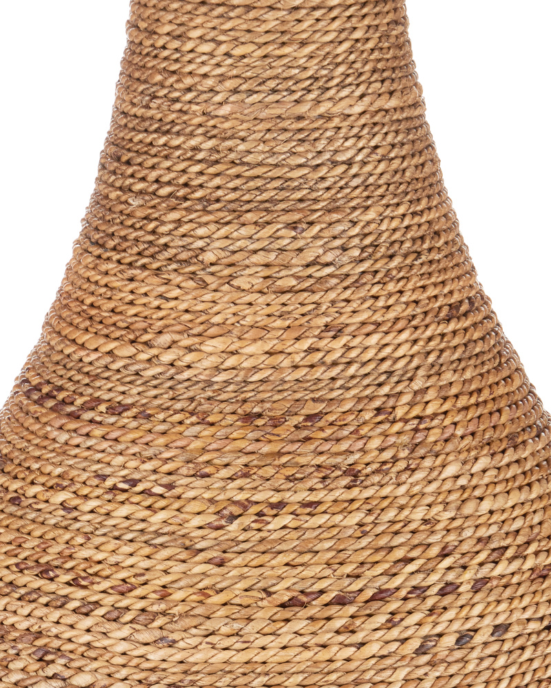 The Dominican Entry Table makes a striking first impression with its sculptural silhouette. Shaped like an inverted wine glass, the round foyer table is meticulously wrapped in abaca rope, showcasing artisanal craftsmanship and highlighting the organic texture of the material. The clear glass top provides a smooth surface while allowing the intricate weaving beneath to remain visible. This artisanal piece will anchor an entryway with warmth and sophistication.