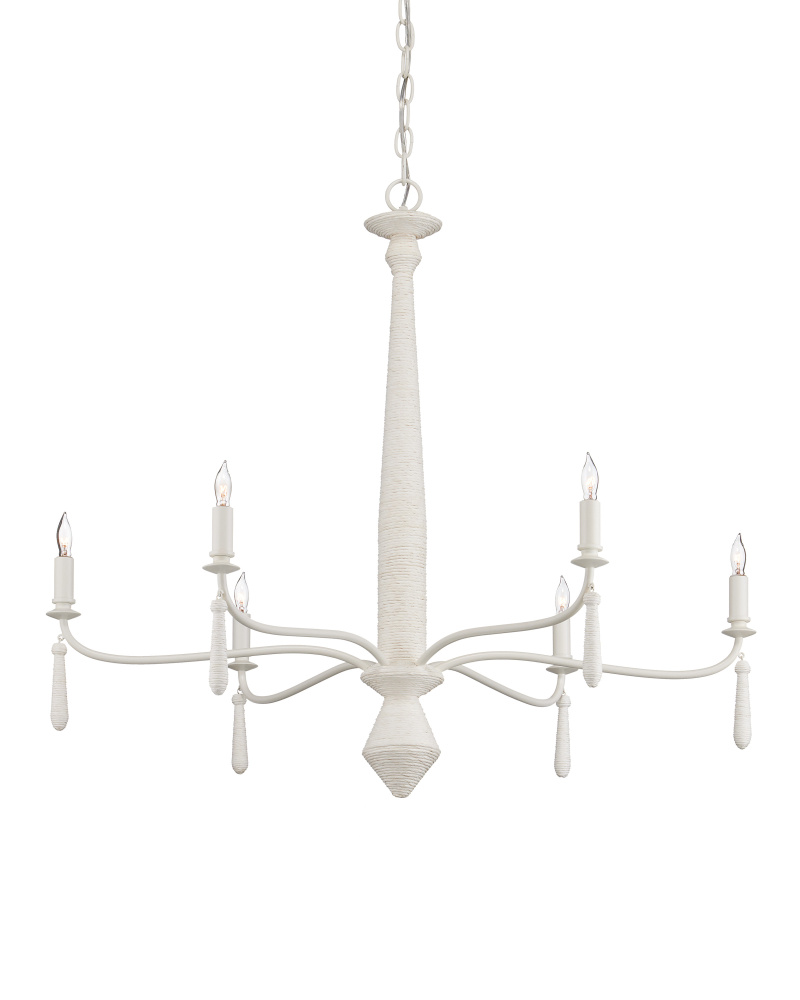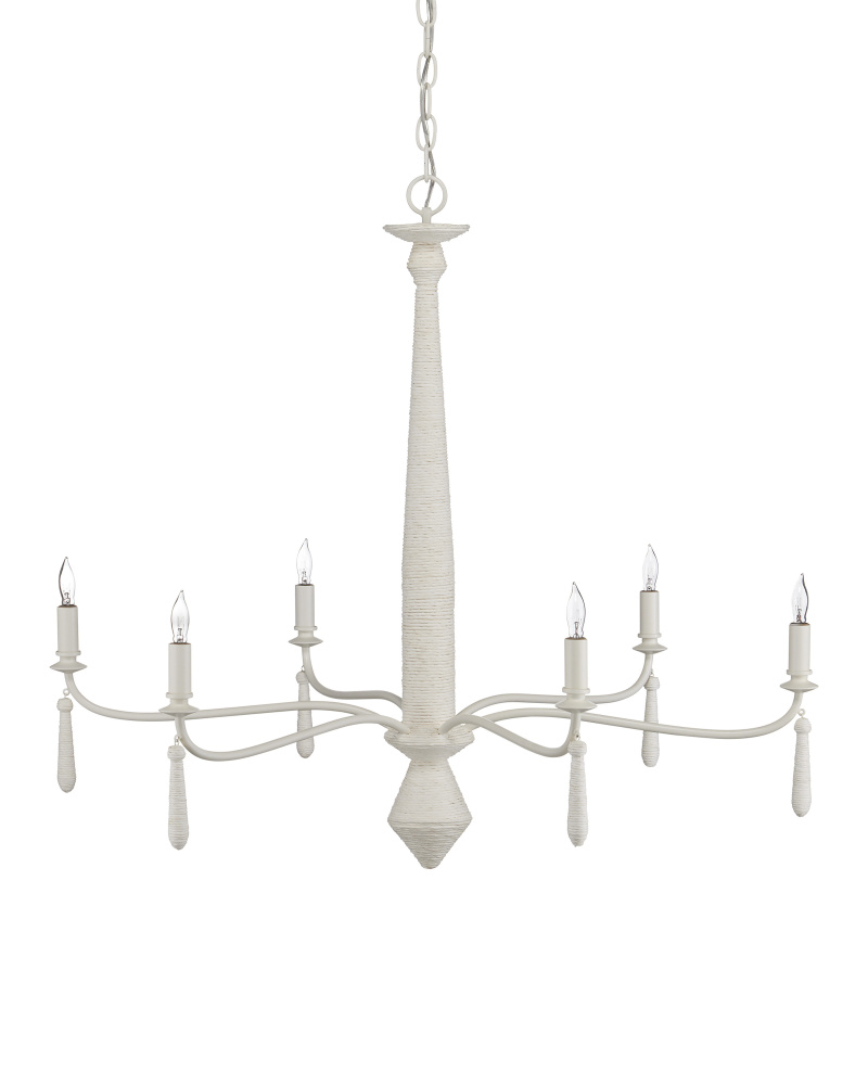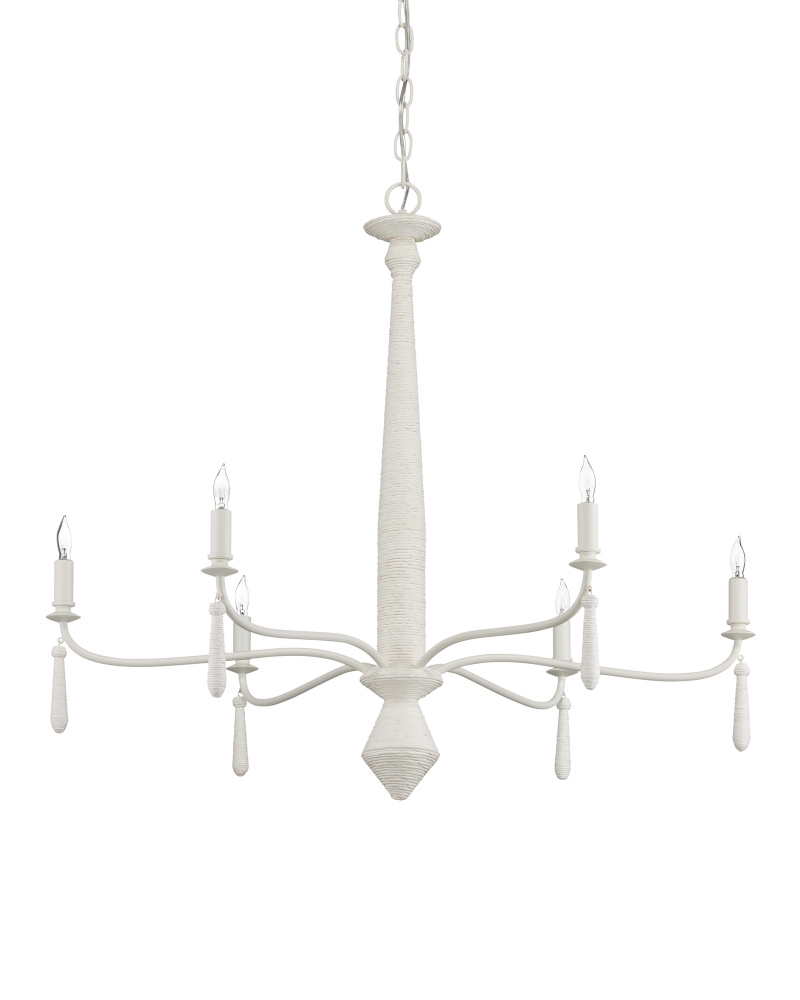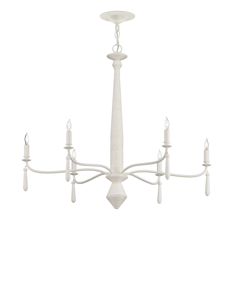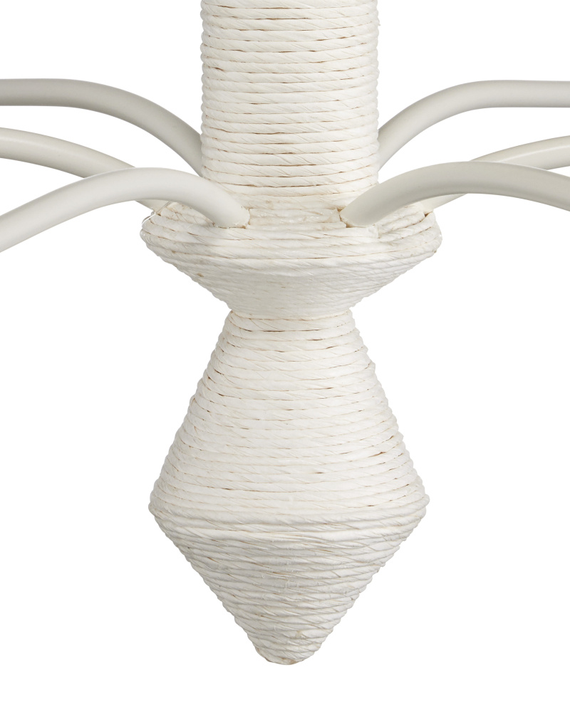 The Donnybrook Chandelier is a textural work of art that combines a contemporized traditional shape and pendants wrapped in Kraft paper twine. The pale material, the wrought iron forming the undulant arms, and the hardware are made seamless when a snow white finish is applied. Adjustable from 35.5" to 103.5" with use of included chain/rod kit/cable. If your space calls for a longer drop, additional chain/rods/cable is available for purchase.