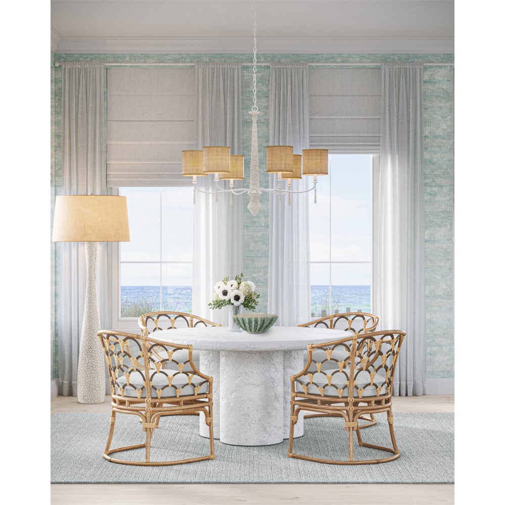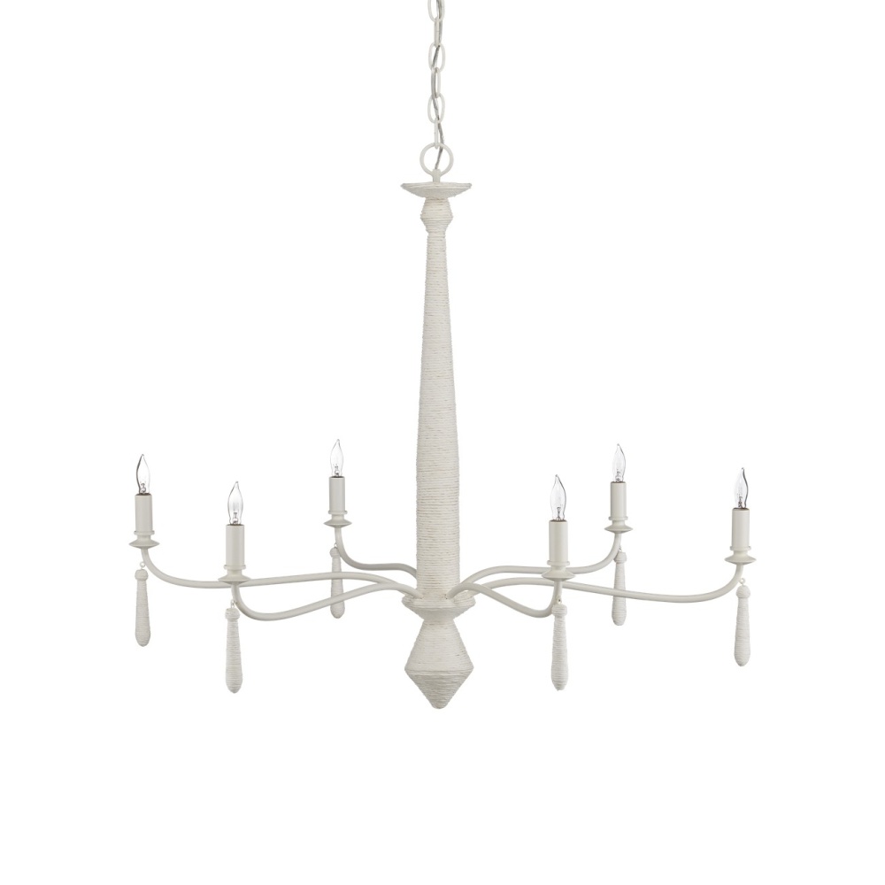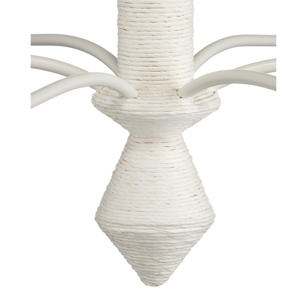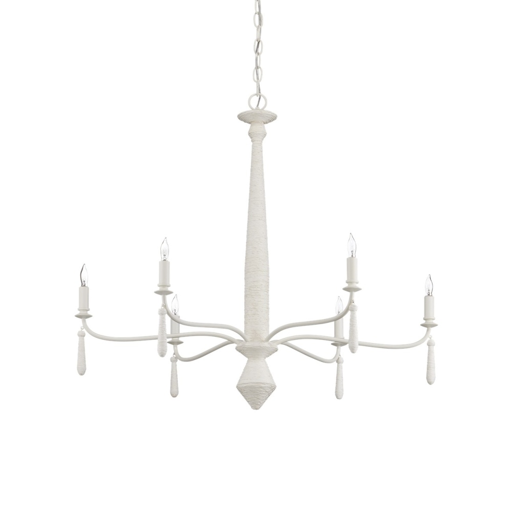 The Donnybrook Chandelier is a textural work of art that combines a contemporized traditional shape and pendants wrapped in Kraft paper twine. The pale material, the wrought iron forming the undulant arms, and the hardware are made seamless when a snow white finish is applied. Adjustable from 35.5" to 103.5" with use of included chain/rod kit/cable. If your space calls for a longer drop, additional chain/rods/cable is available for purchase.