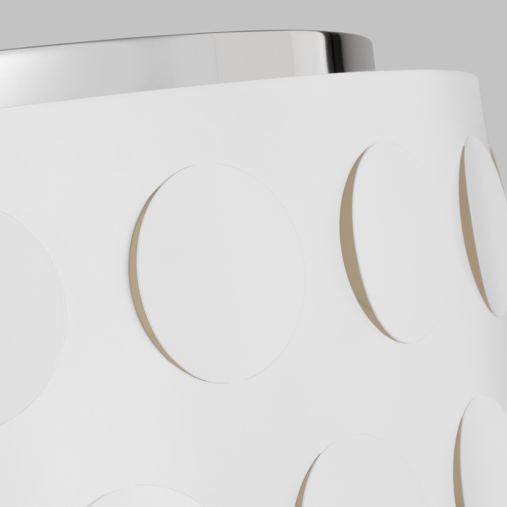 Dots are iconic to the kate spade brand—a simple and playful graphic motif. Dottie takes an iconic kate spade dot motif and cuts it into metal—creating a playful ambient light effect. A classic metal drum shade with an extra twist of perforated pattern. A matte white steel shade with an etched glass diffuser creates a gentle muted glow. Ideal for any hallway, foyer, bedroom, bathroom, or wherever overhead illumination is needed in transitional settings.