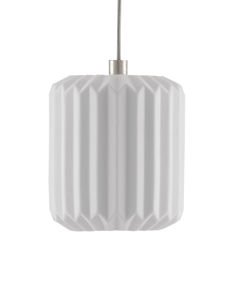 The Dove 7-Light Multi-Drop Pendant has pleated shades made of pale ceramic that diffuse the light wafting through them. The indentions and ridges on the shades of the white pendant bring a textural feel to this luminary even though it is monochromatic. The canopy of this piece is luminous in a painted silver finish. This fixture is among Currey & Company's multi-drop pendant collection, which includes multiple configurations.