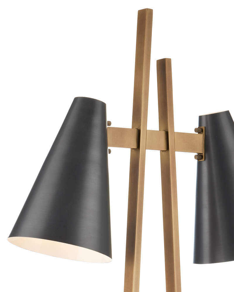 The Duet Floor Lamp has a pair of shades are aimed to give two readers the perfect amount of light when the lamp placed between two chairs. A design detail of note is the asymmetry of the two metal bars that rise up from the base, all in an antique brass finish. The contrasting fixed shades, in an oil-rubbed bronze finish, have white interiors for a brighter glow.