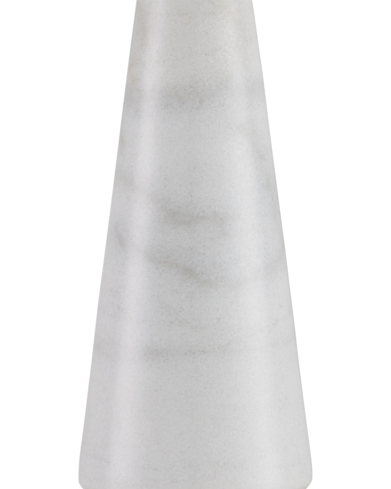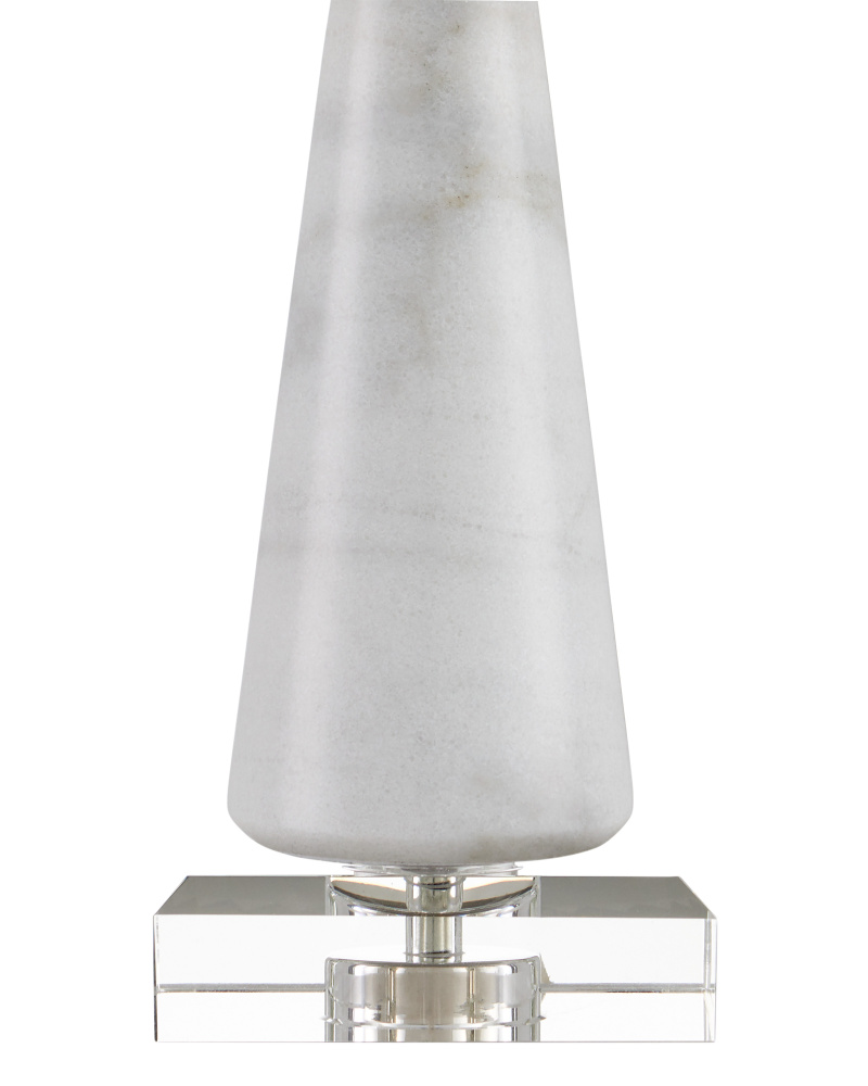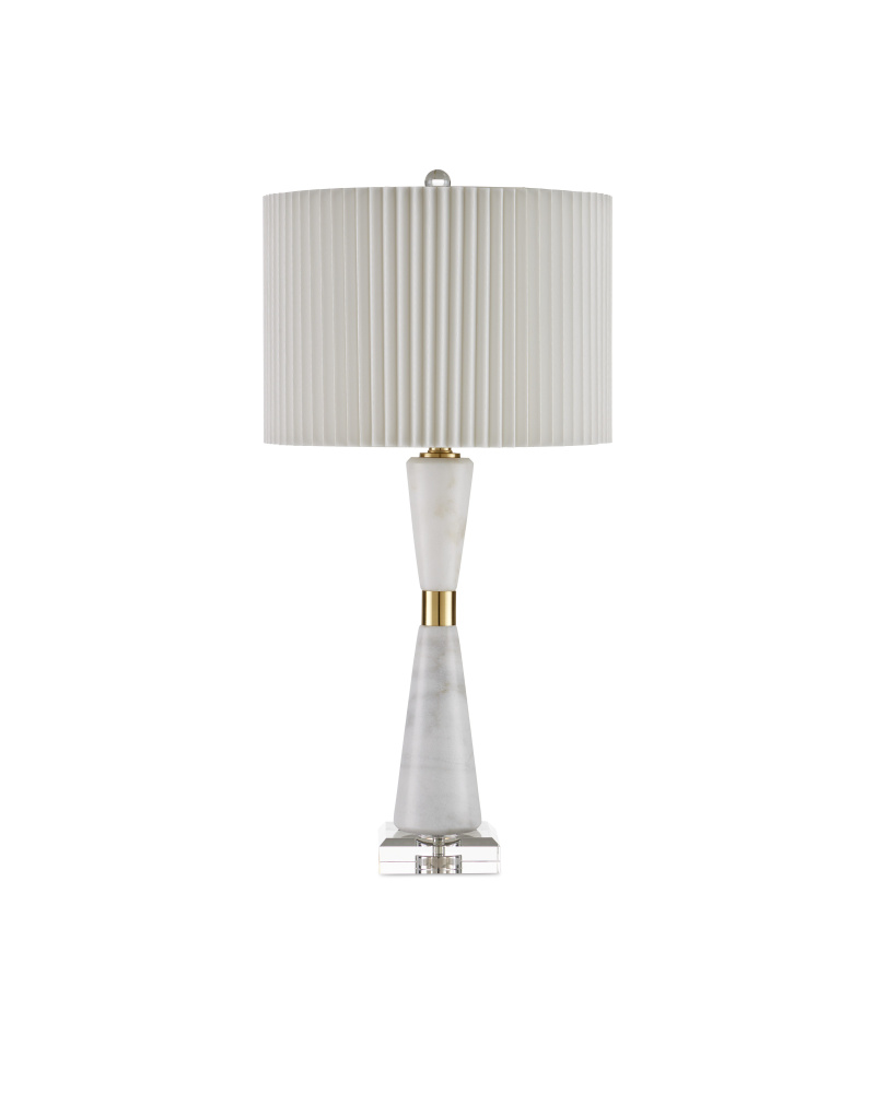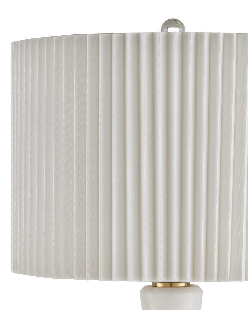 The contemporary shape of the Edelmar White Table Lamp is sleek, while the mix of materials composing it is complex. The body made of white marble cinched in the middle by a brass ring that rises from an optic crystal base. Adding to the intricacy of the design is the knife-pleated off-white shantung shade. An optic crystal finial completes the overall composition.