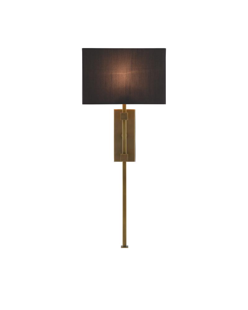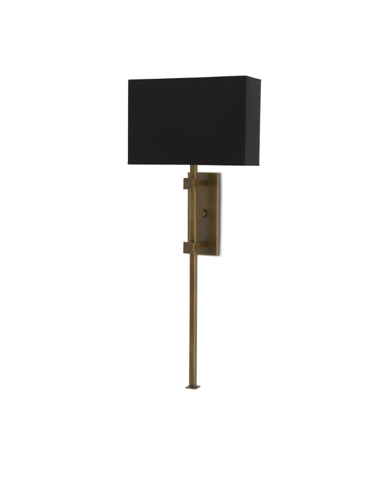 Our Edmund Wall Sconce is made up of an interplay of angular forms. It is the careful placement of each of these that creates a sophisticated profile: the thin vertical stem that extends far beyond the wall plate, in an antique brass finish, and the equally clean-lined black shantung shade set atop them horizontally.