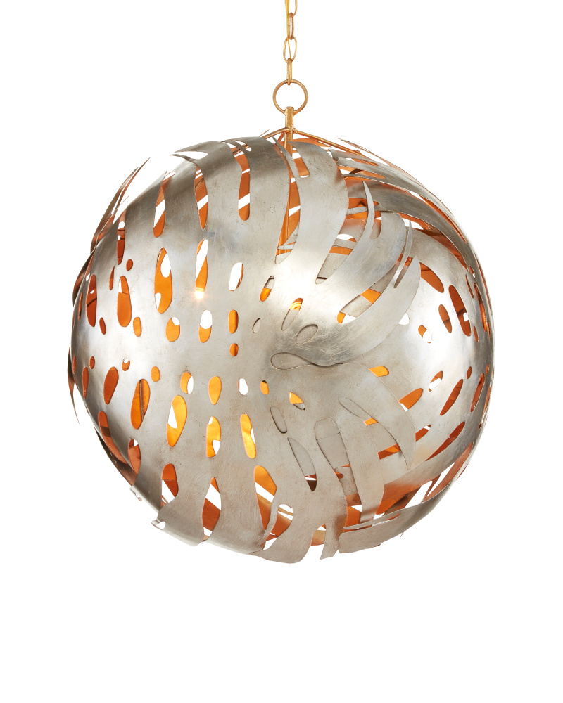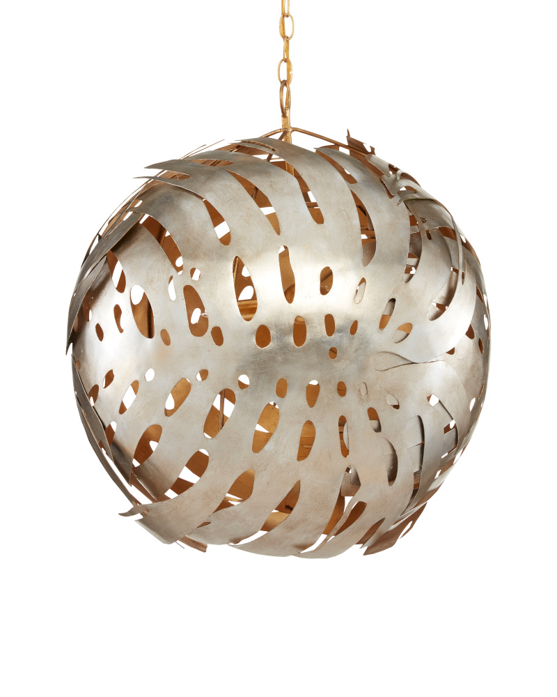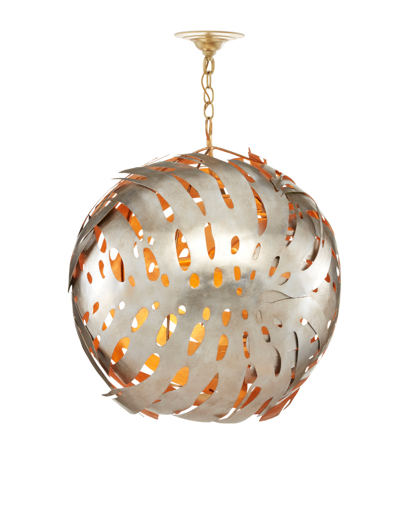Made of wrought iron in a mix of contemporary gold leaf and contemporary silver leaf finishes, the Elder Orb Chandelier was inspired by oversized monstera leaves, a plant in the philodendron family. Made of laser-cut metal that was wrapped over a wooden mold to form the leaves, the artful gold and silver chandelier is as much a wall sculpture as it is a light fixture. Adjustable from 32" to 100.5" with use of included chain/rod kit/cable. If your space calls for a longer drop, additional chain/rods/cable is available for purchase.