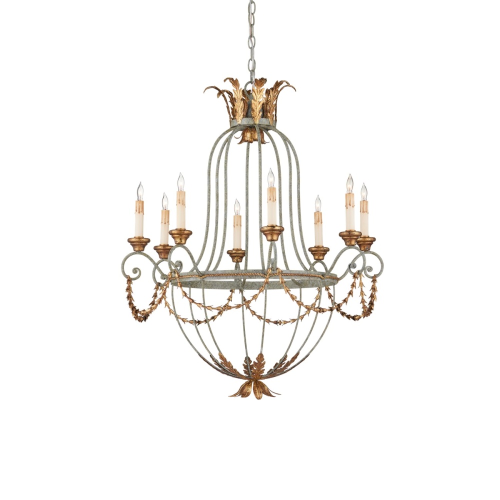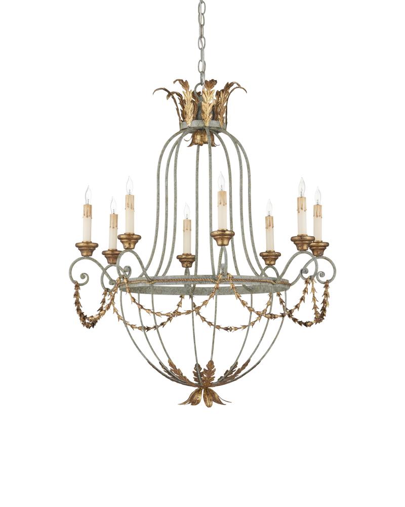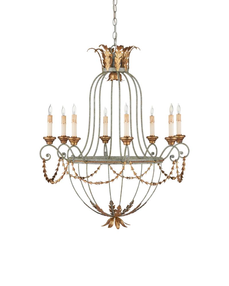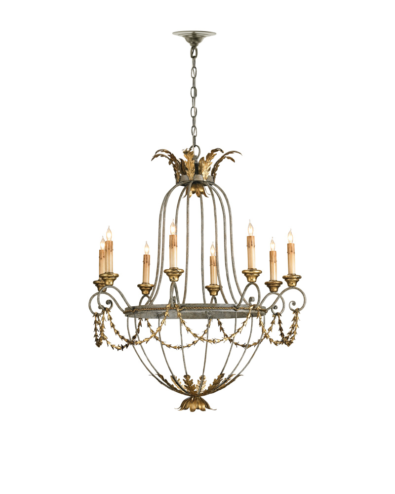 It takes a special design to live up to the name given to this chandelier; fortunately for fans of time-honored aesthetics, the details of this decorative light fixture live up to its moniker. The Elegance Chandelier is embellished with acanthus leaf and rope motifs, the flounces of budlike cords a crowning touch. The fact that some elements are treated to our matte Etruscan finish while others have been given the sheen of gold leaf means this eight-light chandelier carries its Italianate influences with aplomb.