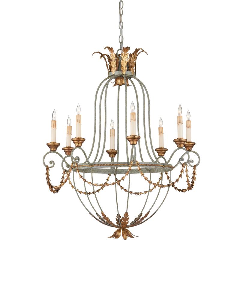 The Elegance chandelier is embellished with acanthus leaf and rope motifs, and flounces of budlike cords. Some elements are subtle in our matte Etruscan finish while others gleam in a gold leaf finish to bring this gold chandelier Italianate influences. A spritz of leaves at the top is a crowning touch on this design. Adjustable from 41" to 108" with use of included chain/rod kit/cable. If your space calls for a longer drop, additional chain/rods/cable is available for purchase.