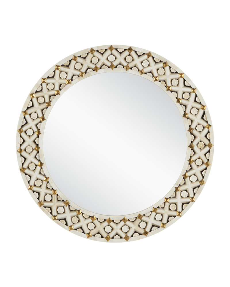 Texture and depth bring our Ellaria Round Mirror, inspired by a traditional Indian design, a powerful punch. Handmade of bone arranged in crosshatches that are inset with floral motifs, also in bone, the round mirror has an exotic appeal with its brass details. This is a remarkably demanding design to achieve given each element is fitted into the composition by hand. The decorative mirror illustrates how refined the handiwork is that comes out of India.