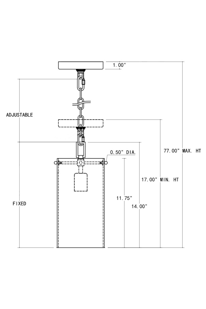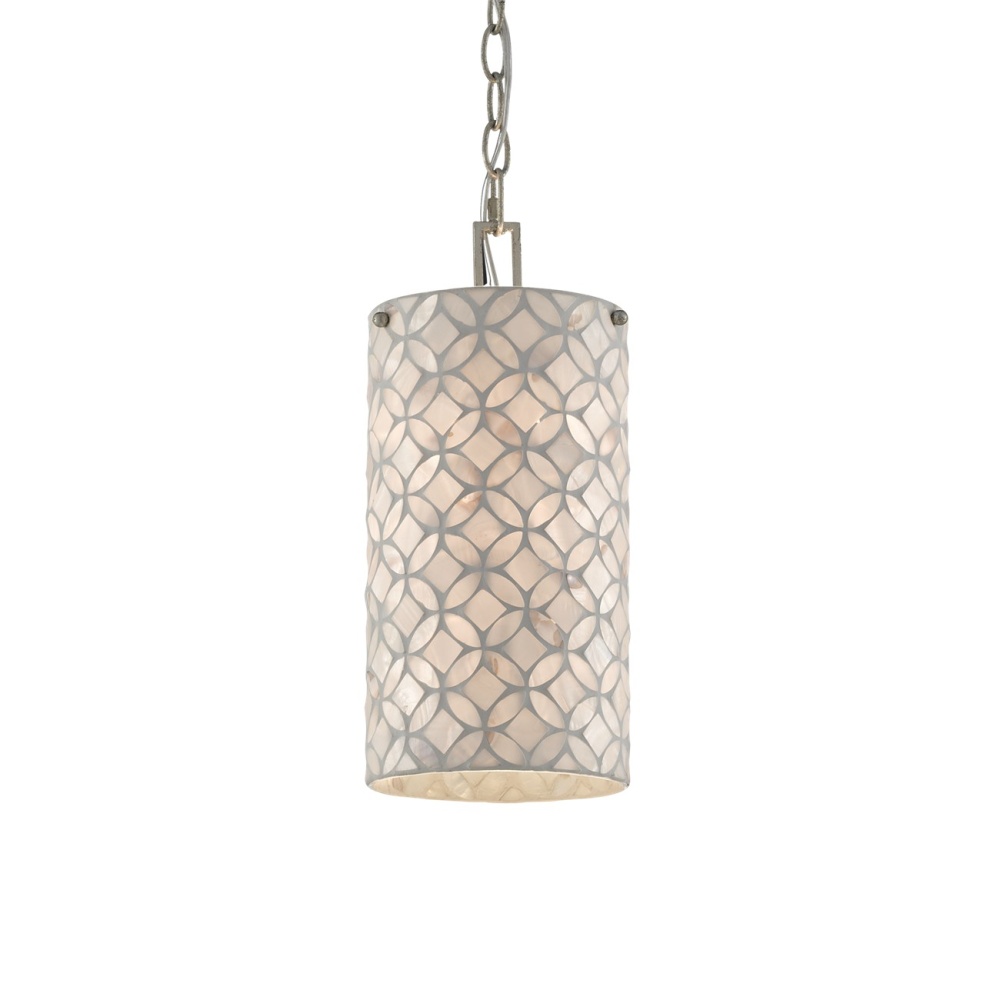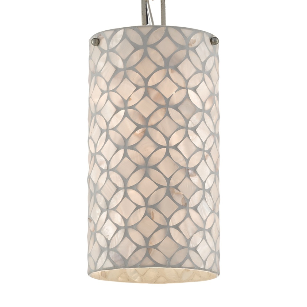 The four-point star and circle pattern on the shade of the Ellison Pendant takes on added luminosity given it is made with mother of pearl. The antique silver leaf finish on the chain and the rectangular chain loop bring geometric interest to this silver pendant. Adjustable from 21.5" to 88.5" with use of included chain/rod kit/cable. If your space calls for a longer drop, additional chain/rods/cable is available for purchase.