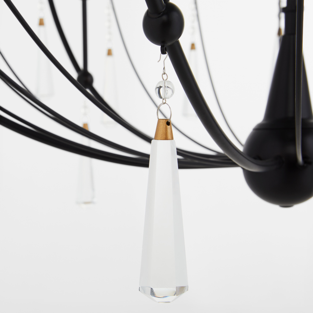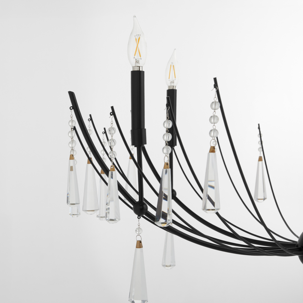 Eloise brings unexpected elegance with its bold, U-shaped design. Thick, droplet-shaped crystals hang from glass beaded strings, adding a luxurious touch. The light source filters through the various-sized arms, casting a soft, refined glow throughout the space. Available in 5-light and 6-light versions, finished in Matte Black.