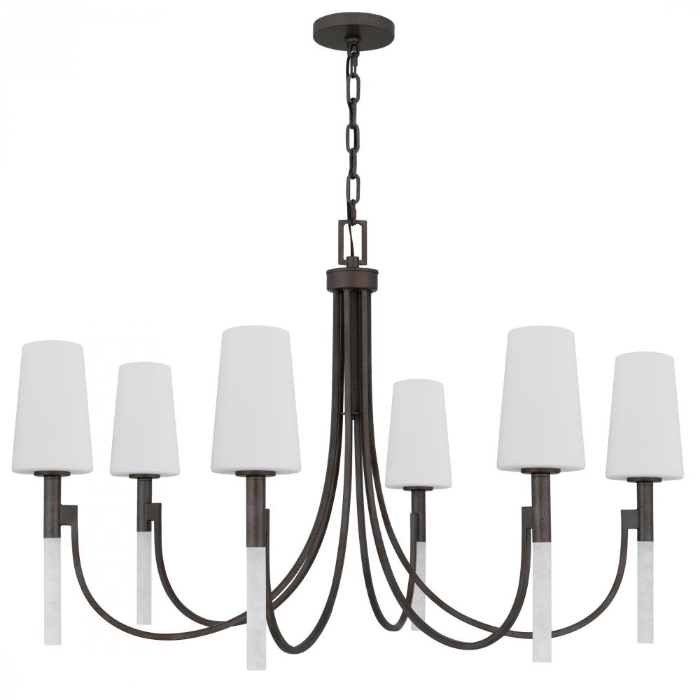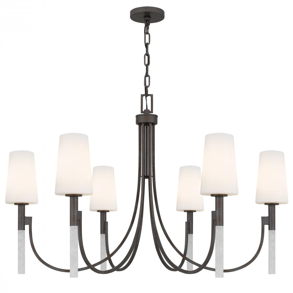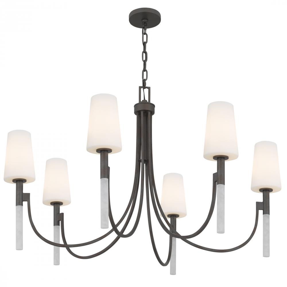 Graceful curves meet sculptural elegance in the Eloura Chandelier, a statement of timeless beauty and modern romance. Finished in a deep iron gate patina, its sweeping arms cradle opal etched glass shades that softly glow like candlelight at dusk. Beneath