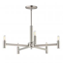Straight extensions of rectilinear arms emanate from a cylindrical center housing in this transitional design. The candelabra is made in a corresponding cylindrical form playing into the geometries of this streamlined chandelier design. Available in a text