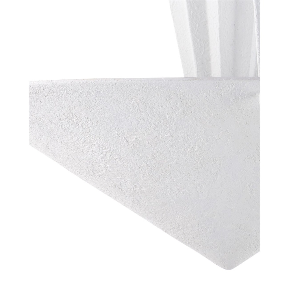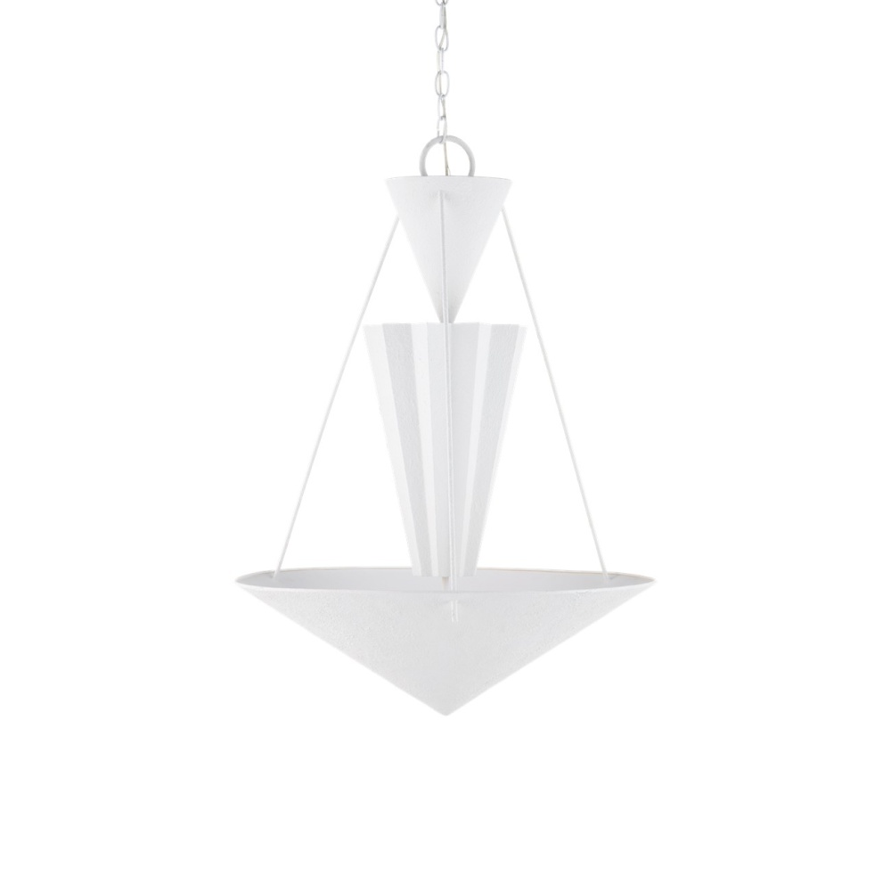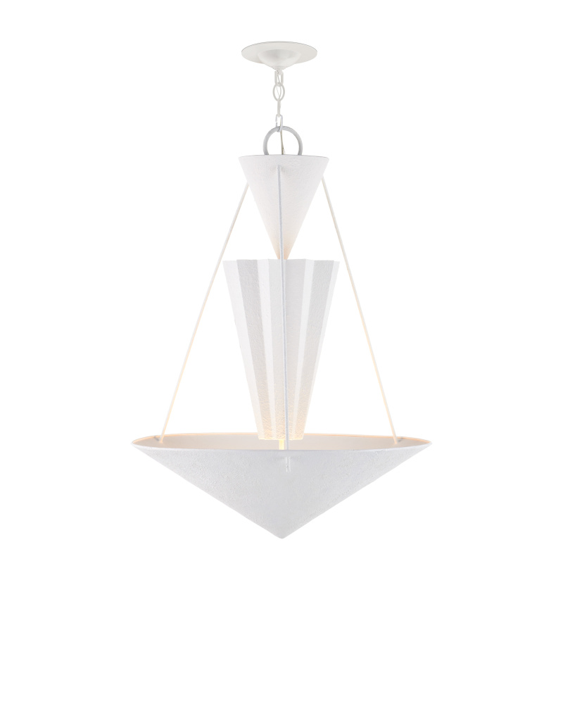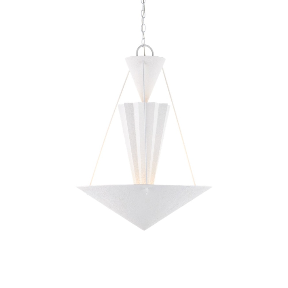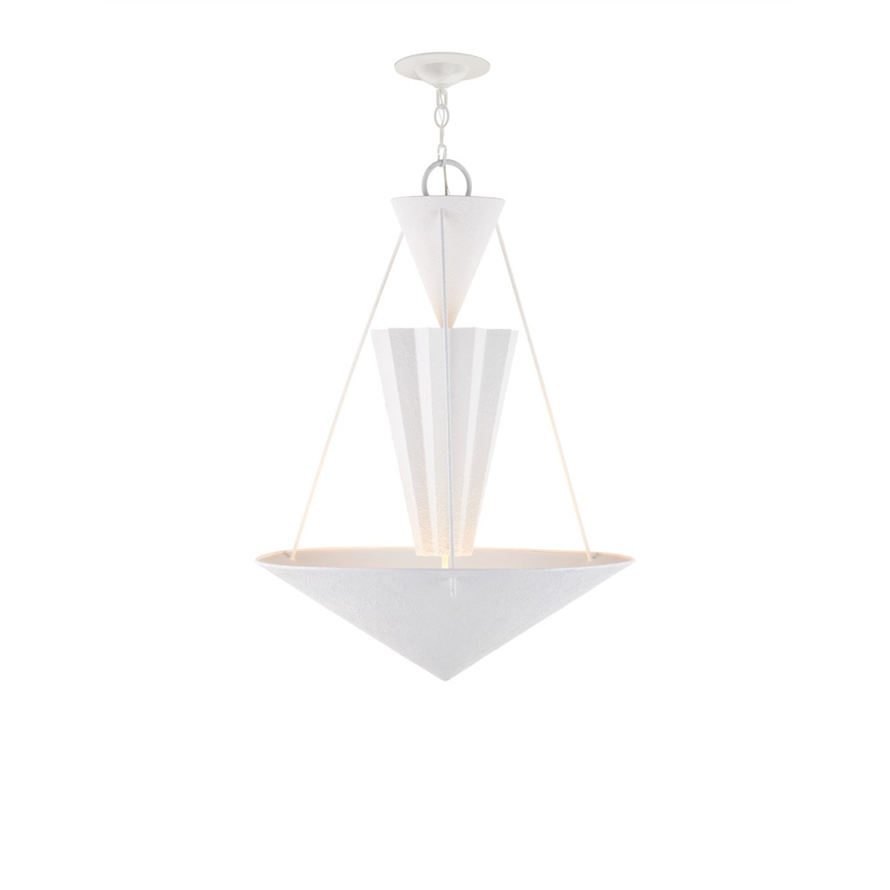 Playing with geometrical shapes that create tiers of up-light, the Empyrean Chandelier was designed with clean lines, making it as contemporary as designs come. The fluted shape of the middle shade is a design detail that brings added interest to the profile of this white chandelier. The wrought iron fixture is covered in a yeso blanco finish that creates a stippled effect to add a subtle tone-on-tone texture to the piece. Adjustable from 38.5" to 106.5" with use of included chain/rod kit/cable. If your space calls for a longer drop, additional chain/rods/cable is available for purchase.