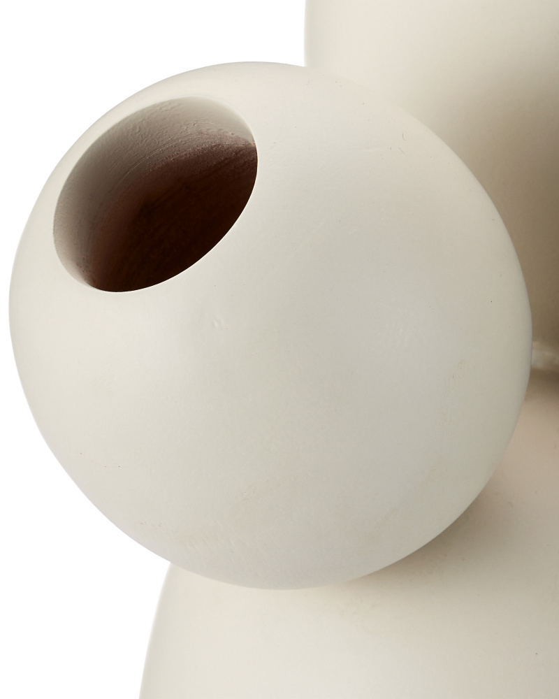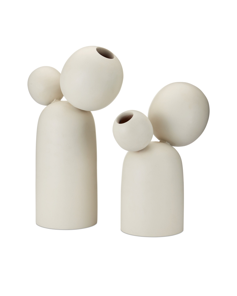 The Ensemble Object Set includes two sculptures with mod profiles made of mango wood and finished in ivory. The geometric shapes that coalesce to make up their profiles bring the decorative accessories a hint of whimsy, and the staggered sizes make them perfect for pairing in a vignette or on a shelf.