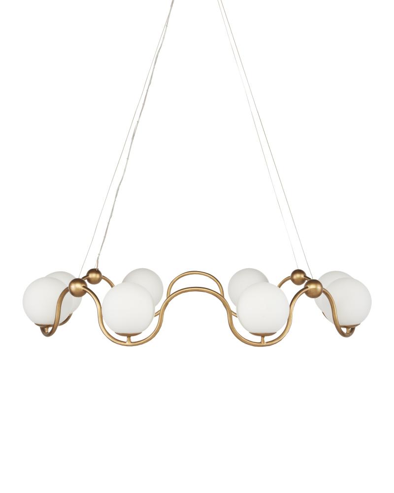 The Equilibrium Chandelier is a gold chandelier with lovely glowing globes inspired by Milano aesthetics. The way the undulant frame swirls around the opaque white glass globes allows the composition to maintain its balance perfectly. The antique brass finish on the wrought iron frame is a warm contrast. A design that is still di rigore in the great opera houses in Italy's most fashionable city of Milan, it brings with it a seriously refined aesthetic. Adjustable from 35" to 120" with use of included chain/rod kit/cable. If your space calls for a longer drop, additional chain/rods/cable is available for purchase.