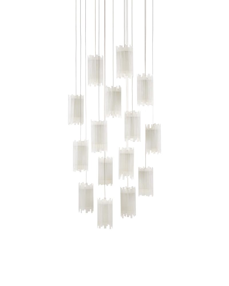 The Escenia Round 15-Light Multi-Drop Pendant has shades made of natural selenite. The ribs of the essential natural material are staggered top and bottom, which brings the shape of the shades added interest. When the lights are switched on, a beautiful glow is created by the crystal bars. The canopy of this piece is luminous in a painted silver finish. This fixture is among Currey & Company's multi-drop pendant collection, which includes multiple configurations.