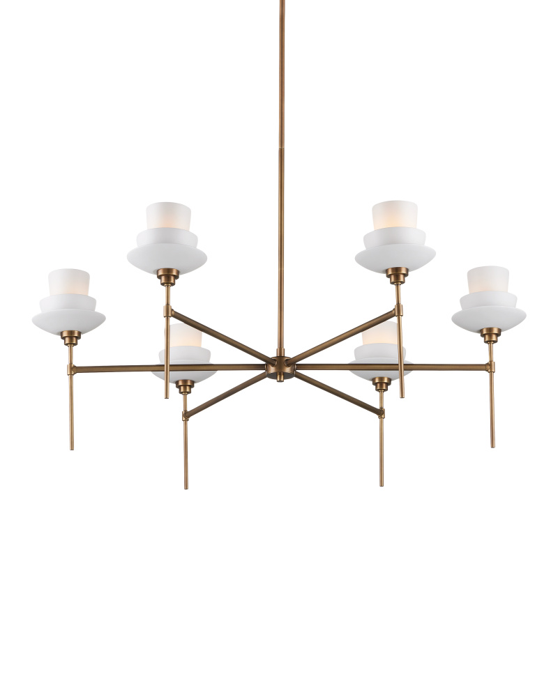 The Etiquette Chandelier is a mid-century-modern inspired chandelier made of metal in an antique brass finish. The telescoping stems hold semi-transparent bone China cups in graduating shapes that resemble tea cups. The luminous material softens the light that reflects from within. This gold chandelier was designed to be an uplight fixture with glowing shades. Adjustable from 24.5" to 66.5" with use of included chain/rod kit/cable. If your space calls for a longer drop, additional chain/rods/cable is available for purchase.
