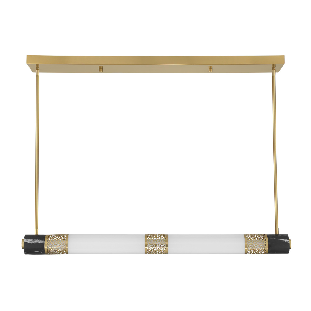 The Savoy House Farrell LED trestle light was designed by Dann Foley, an award-winning interior designer admired for his luxurious and expressive aesthetic. Its elongated tube of white opal glass features intricate laser-cut metalwork and natural black marble accents, delivering a sculptural, luminous focal point. The Warm Brass finish adds inviting warmth. Farrell is 42" in width, 5.88" in length and has an adjustable height ranging from 4" to 58". Comes with eight 12" downrods and two 6" downrods.