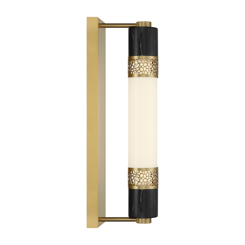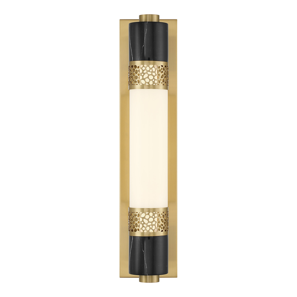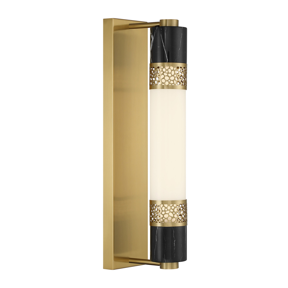 The Savoy House Farrell LED wall sconce was designed by Dann Foley, an award-winning interior designer known for impeccable style and elevated detail. A tube of white opal glass is wrapped in intricate laser-cut metalwork and accented with pieces of natural black marble, striking a captivating balance between modern elegance and organic drama. The Warm Brass finish heightens the glow. Farrell is 21" in height, 4.5" in width and extends 7" from the wall.