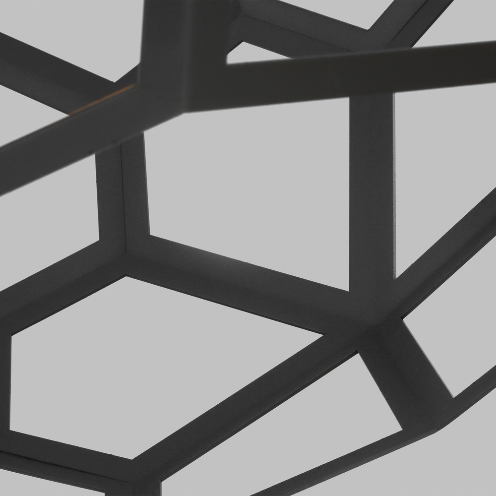 The Alexa Hampton Feccetta one light indoor pendant in midnight black is elegantly charming with a Mid-Century Modern appeal. The fixture is suspended by matching polished brass chain links, and both the shade and socket are held by three smaller chain links. The combination of its circular form with hexagonal shaped cut-out frame, illuminates light from any choice of lamping and can be elegantly placed as the focal point over an island or kitchen table. Alexa Hampton is an industry force who honors tradition and commits to the future, providing smart, stylish, design-rich solutions for every aspect of the home.