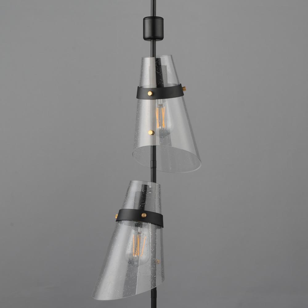 Architectural and effortlessly striking, the Finch collection reimagines classic forms through a modern lens. Tapered cones of clear seedy glass are precision-cut on a diagonal slant, creating dynamic lines that shift with perspective. The Dark Bronze fram