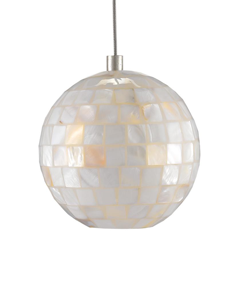 The Finhorn Rectangular 15-Light Multi-Drop Pendant has orb-shaped shades covered with small squares of mother of pearl, painstakingly hand-applied. The canopy of this piece is luminous in a painted silver finish. This fixture is among Currey & Company's multi-drop pendant collection, which includes multiple configurations.