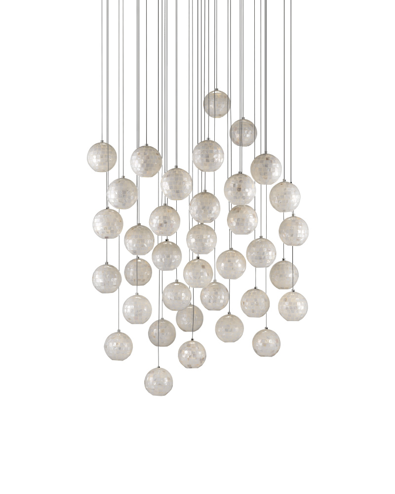 The Finhorn 36-Light Multi-Drop Pendant has orb-shaped shades covered with small squares of mother of pearl, painstakingly hand-applied. The canopy of this piece is luminous in a painted silver finish. This fixture is among Currey & Company's multi-drop pendant collection, which includes multiple configurations.