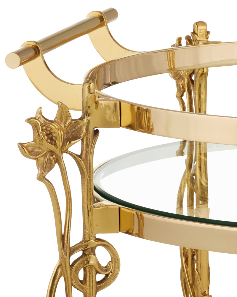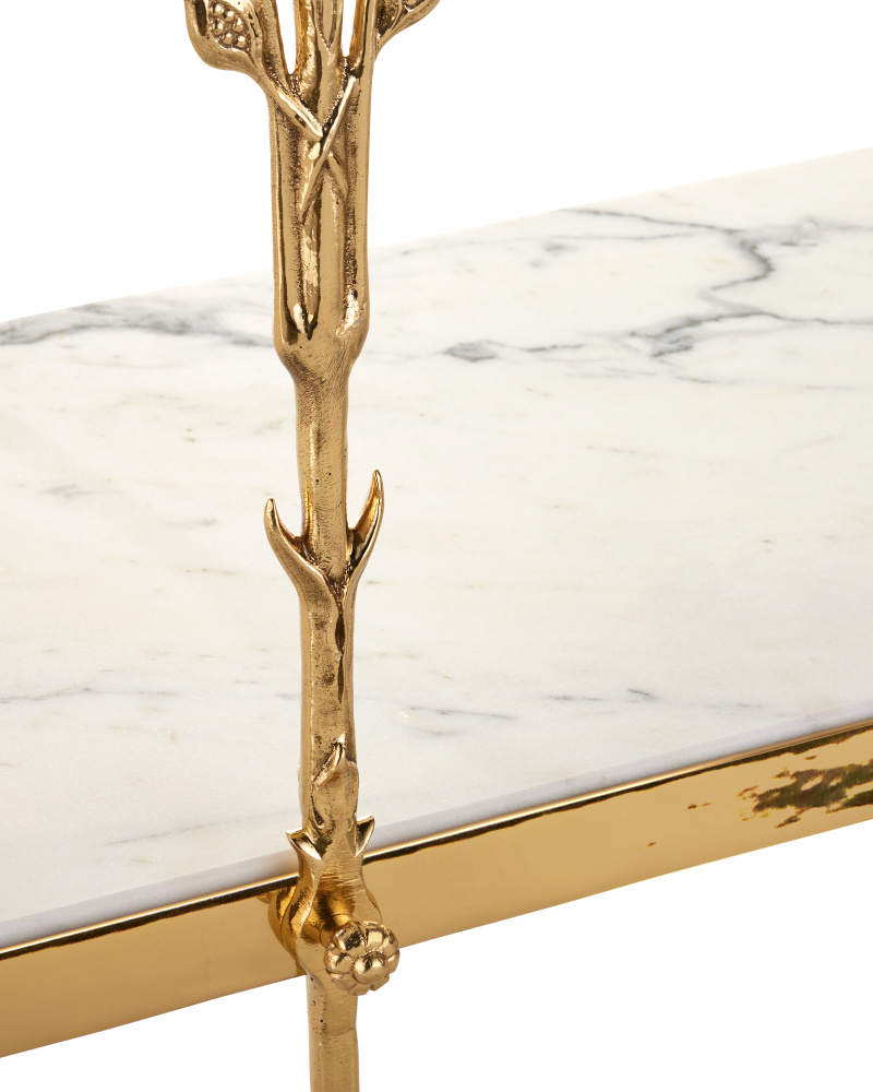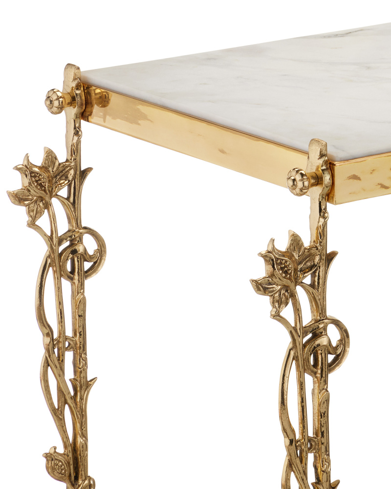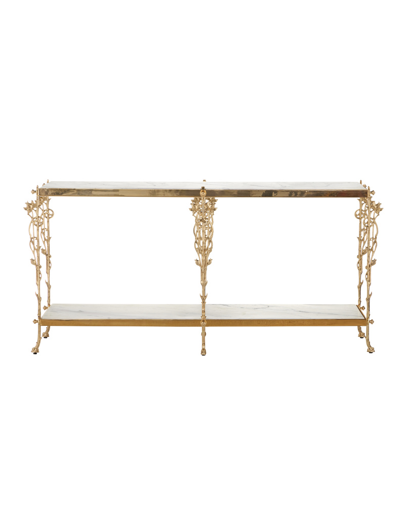 Reflecting its beautiful name, which means flower in Italian, the Fiore Console Table has lovely floral motifs flowing up each of its legs toward a metal band into which a natural white marble top is inset. Just above the graceful ball-shaped feet, another shelf sits, the natural stone a crisp contrast to the luminous polished brass finish.