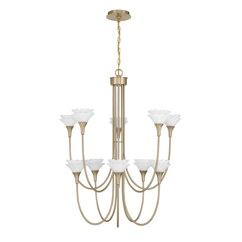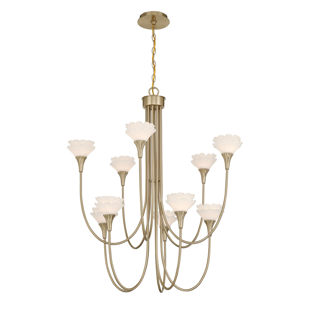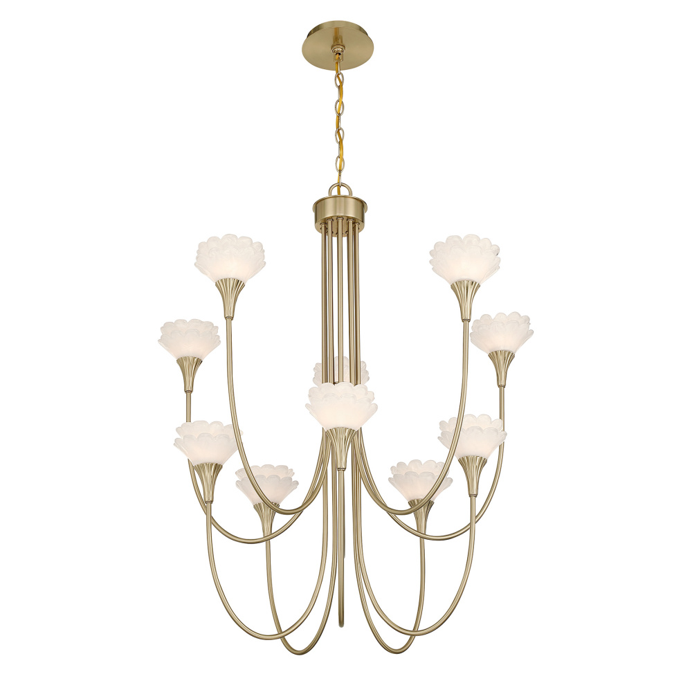 The Savoy House Florena 10-light chandelier is a breathtaking statement piece designed by award-winning interior designer and TV host Breegan Jane. Its array of gracefully sweeping arms holds pairs of luminous pearlescent white glass flowers, creating a blooming display that fills the room with radiant softness. The Noble Brass finish adds a warm, modern glow. Florena is 36" in height and 30" in width. It uses ten G9 bulbs of up to 60 watts per bulb. Bulbs not included. Comes with 120" of chain.