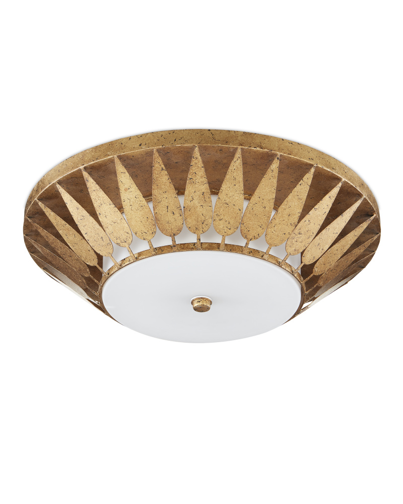 Made of wrought iron in a new gold leaf finish, the Floris Flush Mount has a fluted profile and a milky glass diffuser fastened by a pert finial. Our design team takes great pride in bringing style to flush mounts, a point of view we've developed over decades of creating ceiling lights and this gold flush mount is our latest iteration.