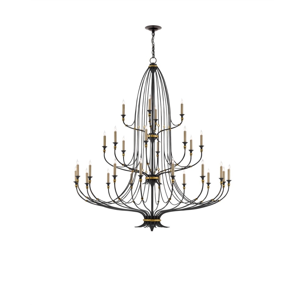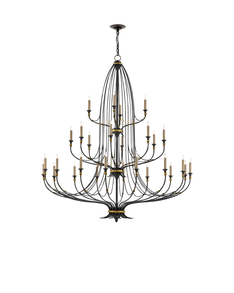 With a sweeping open form based on influences as diverse as Federal style and French neoclassicism, the Folgate Grande Chandelier is surprisingly large in scale given its airy appearance. The 28-light black chandelier is made of wrought iron in a French black finish, which is then enlivened by gold leaf accents. Adjustable from 68" to 150" with use of included chain/rod kit/cable. If your space calls for a longer drop, additional chain/rods/cable is available for purchase.
