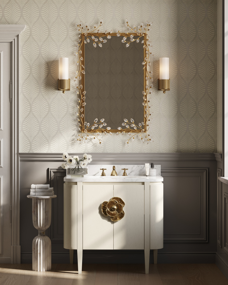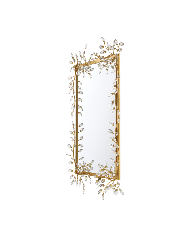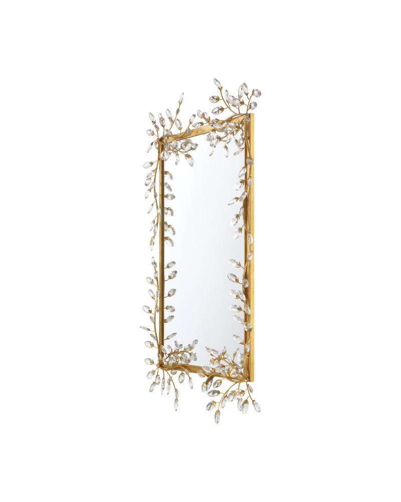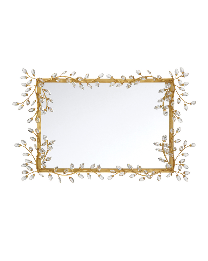 The Forget-Me-Not Gold Rectangular Mirror has sparkling floral accents with flowing buds made of crystals. At its center, a beveled mirror is inset into the frame in a gold leaf finish. The decorative mirror is both a functional piece and a work of art, as each crystal is hand-pinned. The nicely sized mirror measures 49 inches high and 30.5 inches wide, and cleats allow for hanging it horizontally and vertically.