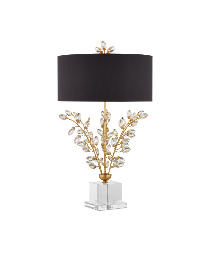 On stems of metal that have been treated to a rich Chinois gold leaf finish, a spray of luxuriant beveled optic crystal buds burst forth on the Forget-Me-Not Table Lamp. Besides the lamp’s bouquet, other romantic details include a simple black shantung drum shade and a clean-lined stacked crystal base. Topping off this nosegay of a lamp, which stands 32-inches tall, is a pert crystal finial.