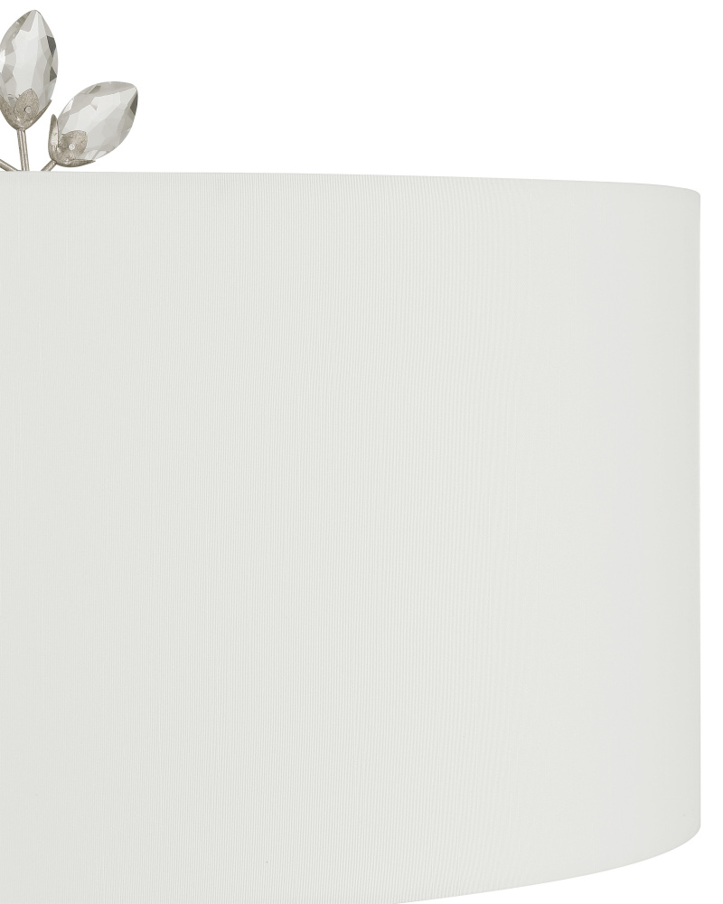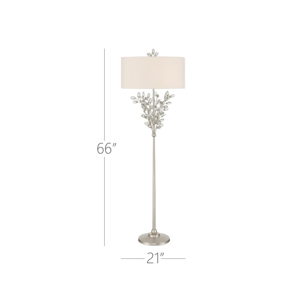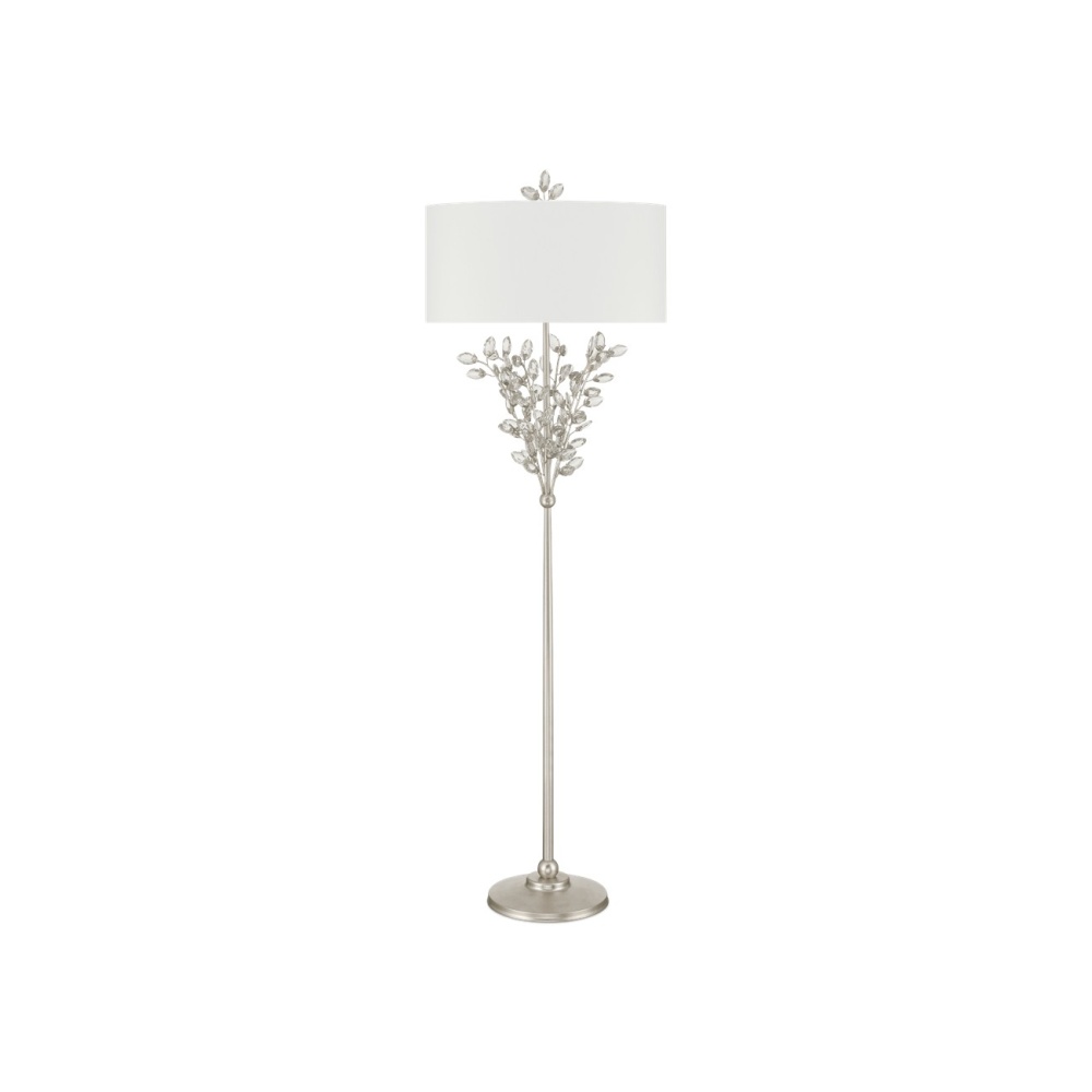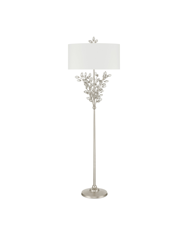 The Forget-Me-Not Silver Floor Lamp has sparkling floral accents with flowing buds made of crystals. Complementing the silver leaf finish, the sprays of crystal flow up from the thin stem to capture the illumination. The fixture is a functional piece and a work of art, as each crystal is hand-pinned. The reduced height of the drum shade, which is fastened to the fixture with a crystal finial, is an elegant touch for this two-light floor lamp.