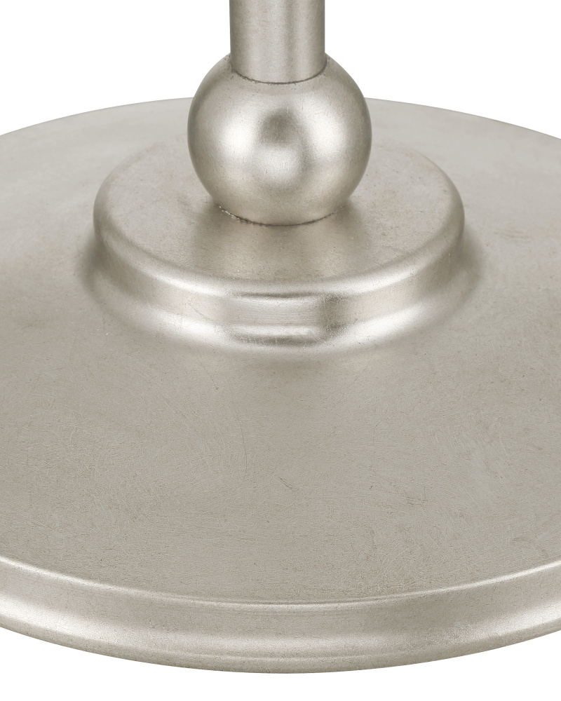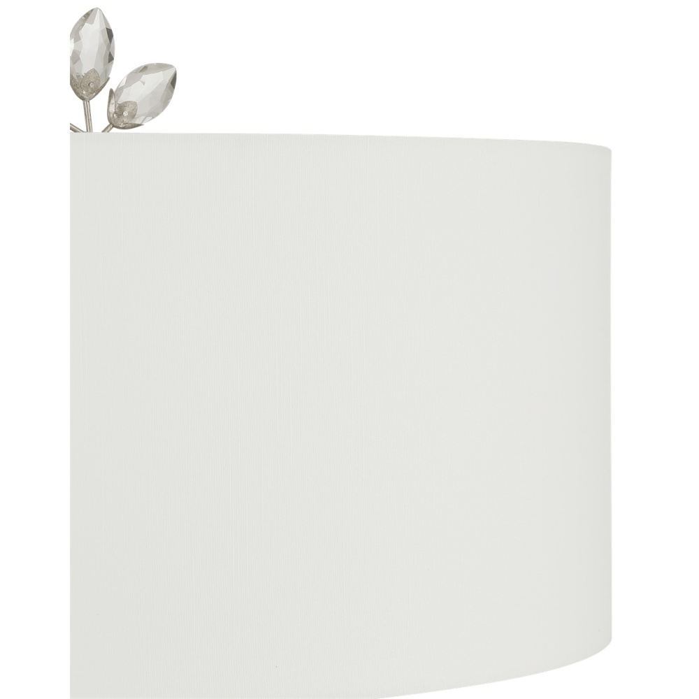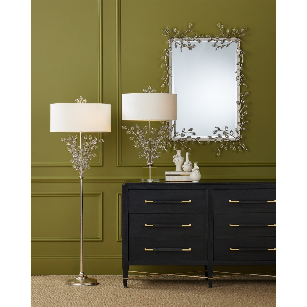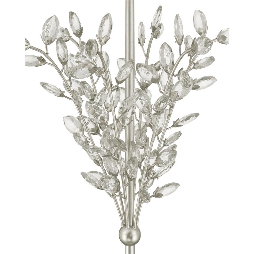 The Forget-Me-Not Silver Floor Lamp has sparkling floral accents with flowing buds made of crystals. Complementing the silver leaf finish, the sprays of crystal flow up from the thin stem to capture the illumination. The fixture is a functional piece and a work of art, as each crystal is hand-pinned. The reduced height of the drum shade, which is fastened to the fixture with a crystal finial, is an elegant touch for this two-light floor lamp.