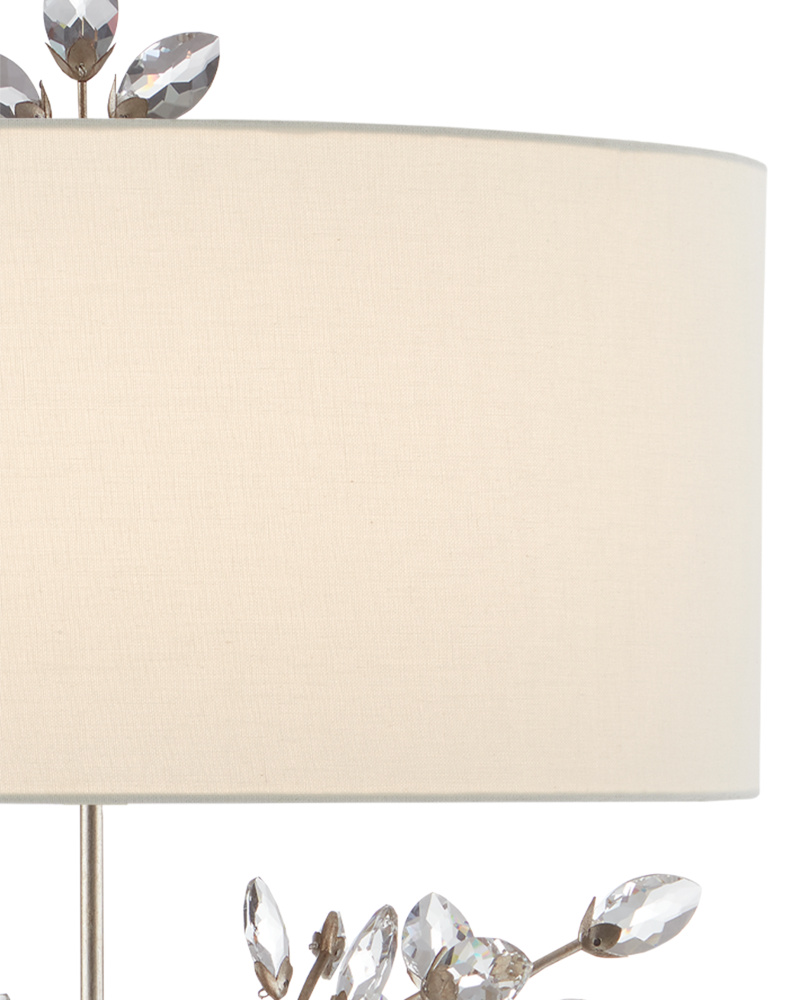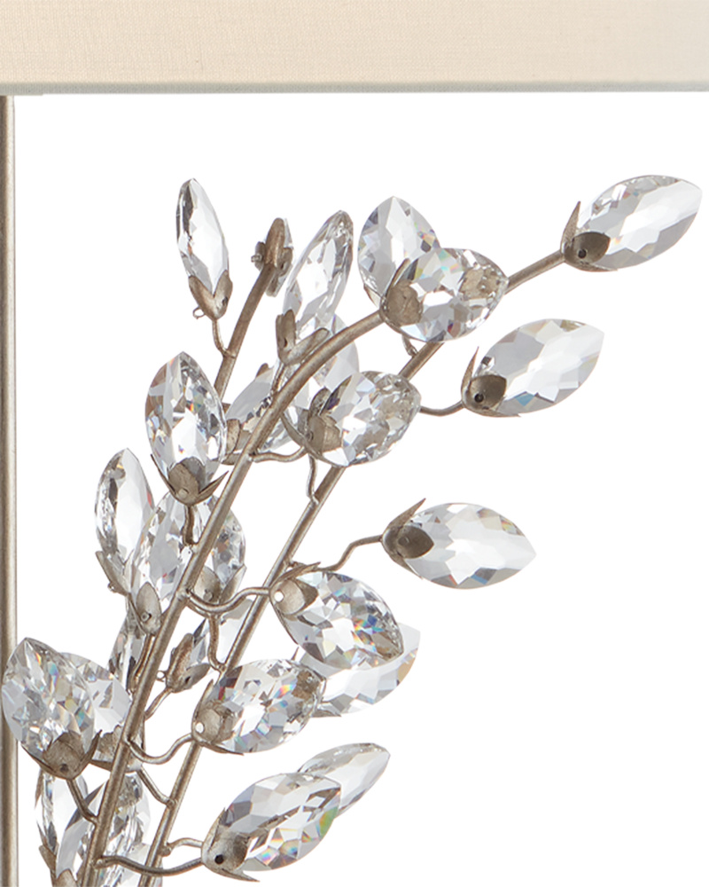 Joining the Forget-Me-Not Table Lamp in gold leaf finish and a black shade is the Forget-Me-Not Silver Table Lamp with gleaming silver leaf-finished stems that hold luxuriant beveled optic crystal buds. Other notable details on this crystal lamp include a crystal finial and stacked base, and a white drum shade in perfect proportion to the spray of crystals. These luminous lamps are beautifully crafted to enhance any space.