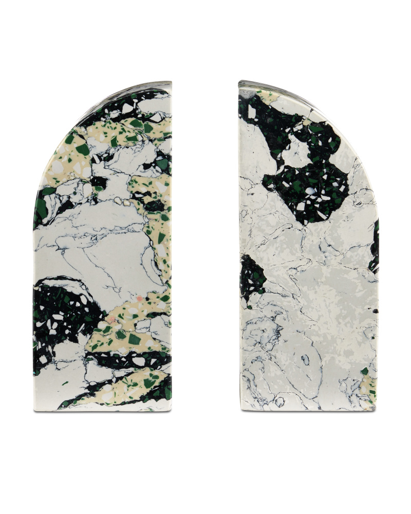 The Fossey Object Set is a pair of sculptures that look like they are made of natural granite, but are actually made of synthetic stone. The black and white decorative accessories with hints of green and pale yellow have swirling personalities that make them textural accents. The one curved edge brings them interesting profiles.