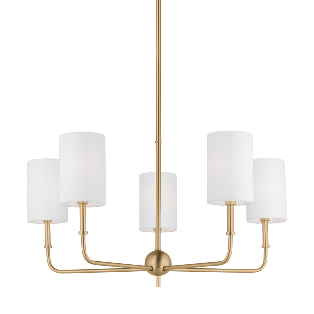The Foxdale five light single tier chandelier in Satin Brass encompasses the new traditional style with flawless execution. Refined and clean-lined, this classic silhouette is timeless without being stuffy. Perfectly transitional, this collection can be placed in any home regardless of style. Topped with White Linen Shades to complete the design.