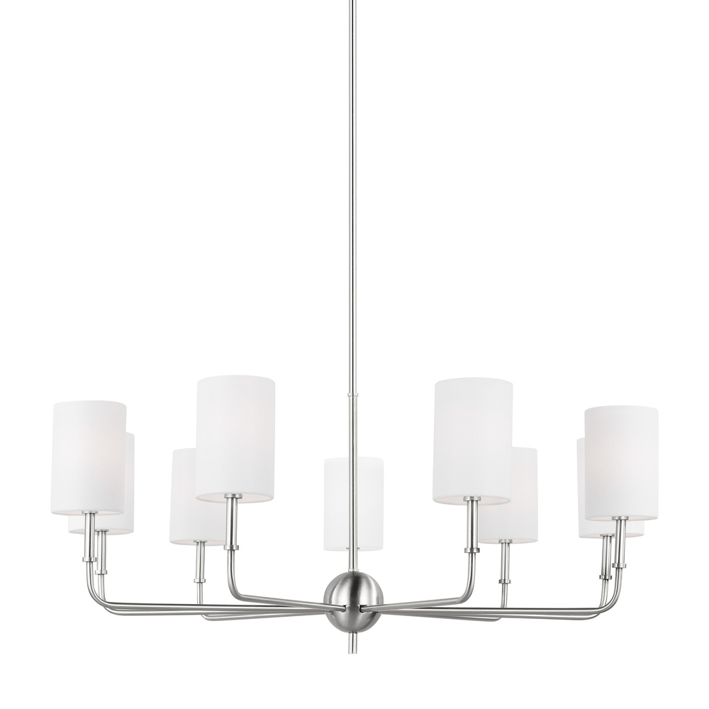 The Foxdale nine light single tier chandelier in brushed nickel silver encompasses the new traditional style with flawless execution. Refined and clean-lined, this classic silhouette is timeless without being stuffy. Perfectly transitional, this collection can be placed in any home regardless of style. Topped with White Linen Shades to complete the design.