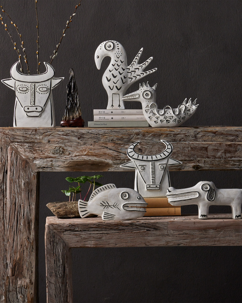Artist Xiang Yang, a brilliant ceramist, took a walk on the wild side when he created Frank the Bull. Made of porcelain in a washed-white finish with black whimsical details painted by the artist, the haunting vessel will create a stir not unlike Picasso's work did during his ceramics period as he experimented in the South of France.