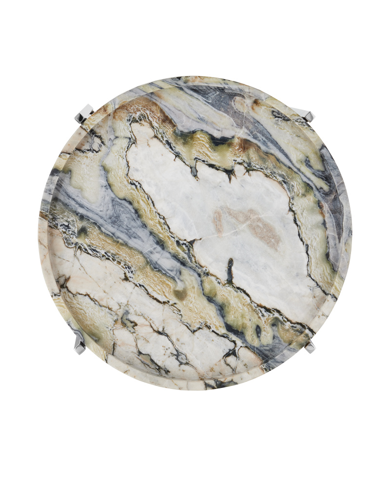 The Freya Floral Jade Marble Accent Table has bold natural markings that are so dynamic, its top reads like a modernist painting. The characteristics of the stone include waves of color and strong patterns. The tray top slides into a minimalist frame made of metal in a polished nickel finish that is a sleek element to contrast the organic nature of the stone. There will be significant variations from piece to piece given the material from which it is made.