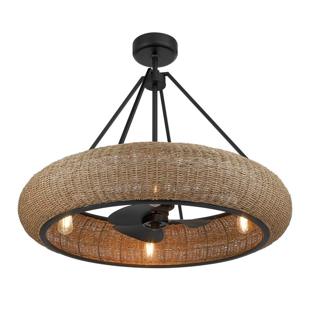 The Savoy House Gaia 4-light Fan D’Lier transforms natural texture into a showstopping statement. Designed by award-winning designer and TV host Breegan Jane, it features richly woven seagrass that wraps the fixture in warmth and organic character. The Matte Black finish adds striking contrast while the efficient DC motor keeps air circulating with quiet sophistication and the included remote ensures simple, intuitive control. Gaia stands 17" tall and 45.75" wide. Four standard size LED bulbs are included as well as a 4" and 18" downrod. As part of the Savoy House Fan D’Lier collection, it unites the artistry of a chandelier with the refreshing comfort of a ceiling fan to create an inspired combination of texture, style, and function.