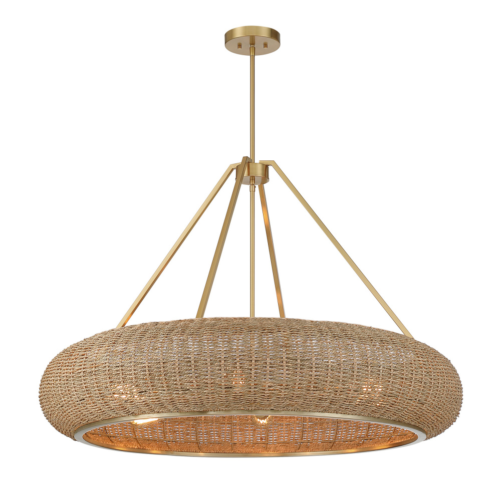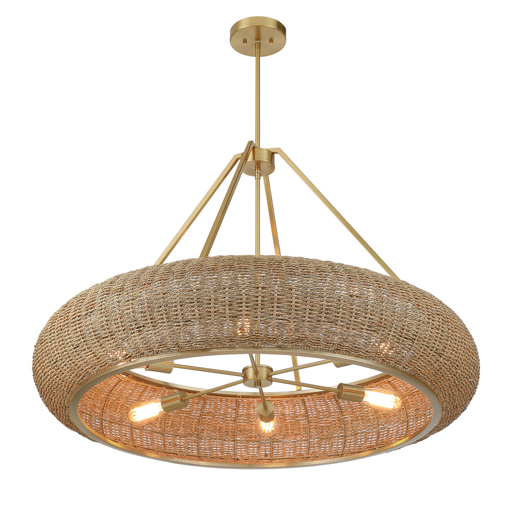The Savoy House Gaia 6-light chandelier channels a serene, nature-inspired elegance shaped by designer Breegan Jane. Its white woven seagrass shades glow with gentle texture, echoing the beauty of handmade craftsmanship while the Warm Brass finish adds a welcoming, sun-kissed warmth. Together, they create a chandelier that feels both elevated and effortlessly calming. Gaia measures 40" in width with an adjustable height from 29" to 83". It uses six standard size bulbs of up to 60 watts each (not included) and comes with four 12" downrods and one 6" downrod. This design brings organic texture and designer-led ease into any space.