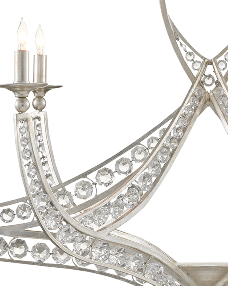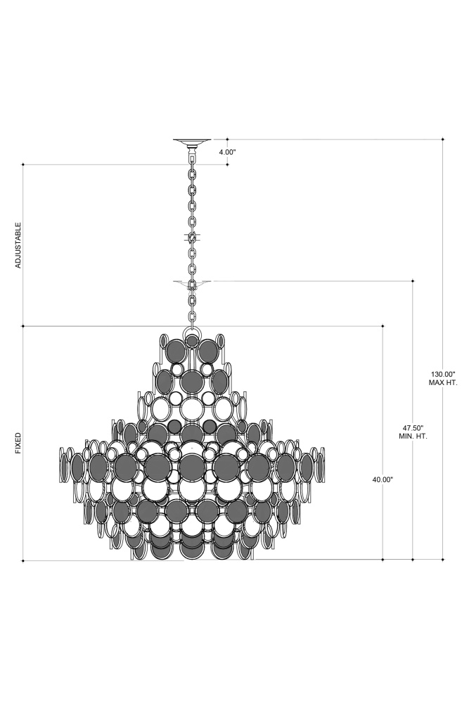 The Galahad Blue Chandelier has recycled glass and recast glass discs that are individually attached by hand to hang from its immense wrought iron frame finished in contemporary silver leaf. The size of this chandelier with its intermingling of clear and blue glass discs is impressive, as are the reflected hues that glint through the circlets that make up the shade. Adjustable from 47.5" to 130" with use of included chain/rod kit/cable. If your space calls for a longer drop, additional chain/rods/cable is available for purchase.