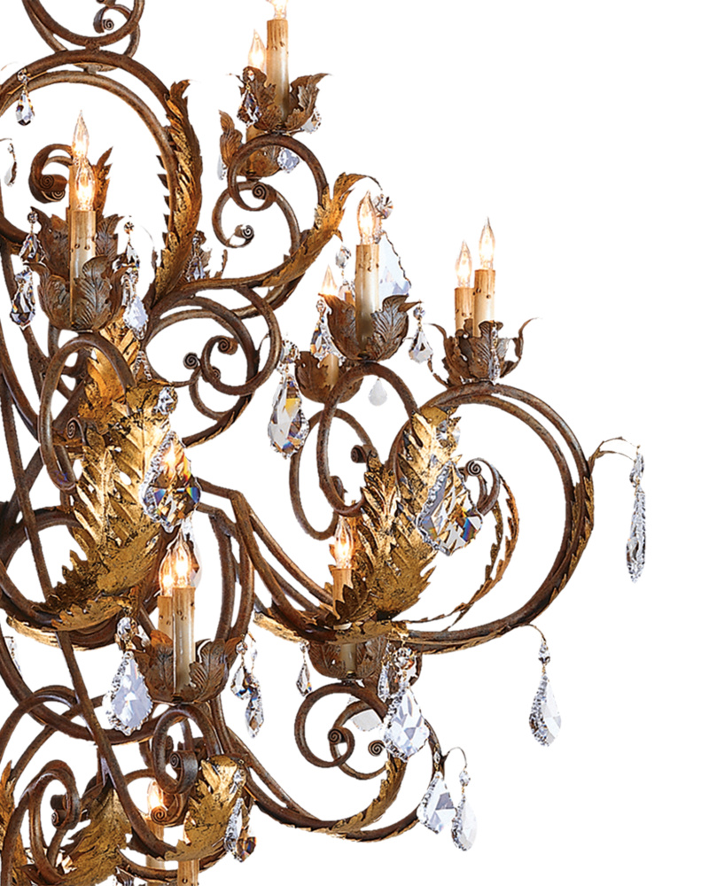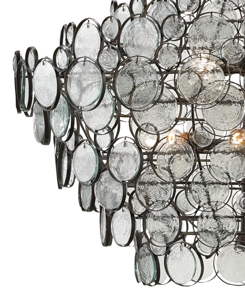 The Galahad Chandelier has recycled glass and recast glass discs that are individually attached by hand to hang from its immense wrought iron frame finished in bronze. The size of this twelve-light glass chandelier is impressive, as are the reflected hues that glint through the recycled discs that make up the shade.