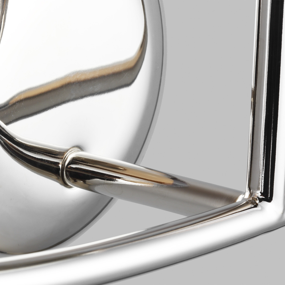 The Galassia three light wall sconce in polished nickel perfectly balances a glass globe and curving teardrop frame, giving it a contemporary look. The white glass casts a soft, welcoming glow over a space. This piece works particularly well in a hallway.
