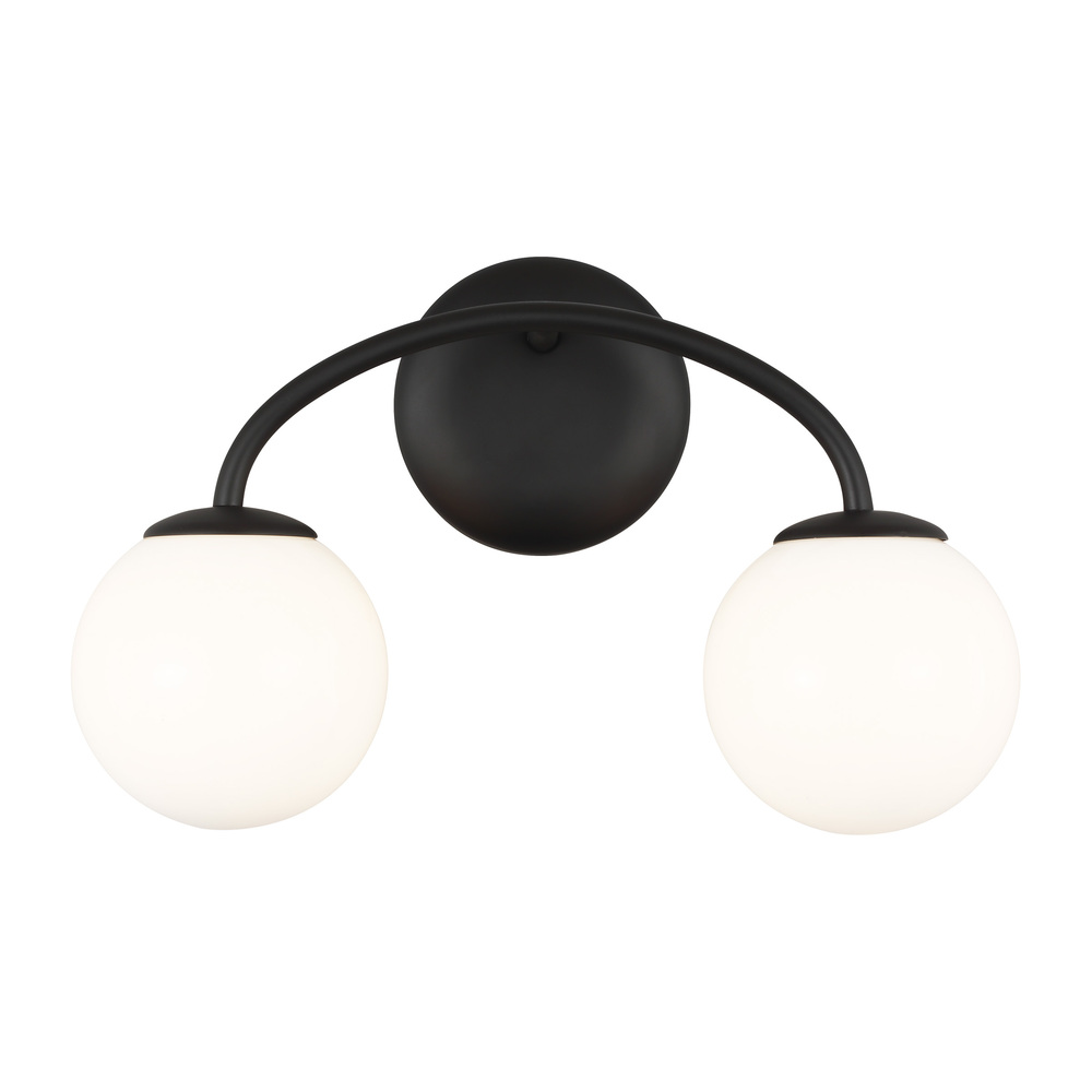 The Galassia two light wall sconce by AERIN in midnight black perfectly balances a glass globe and curving teardrop frame, giving it a contemporary look. The white glass casts a soft, welcoming glow over a space. This piece works particularly well in a hallway.