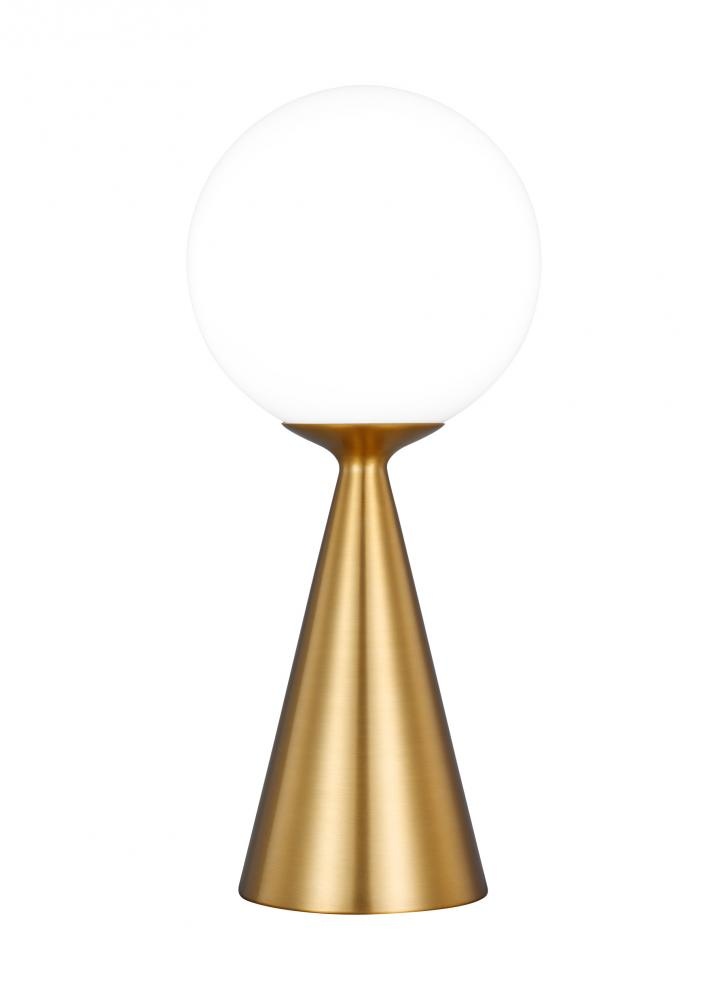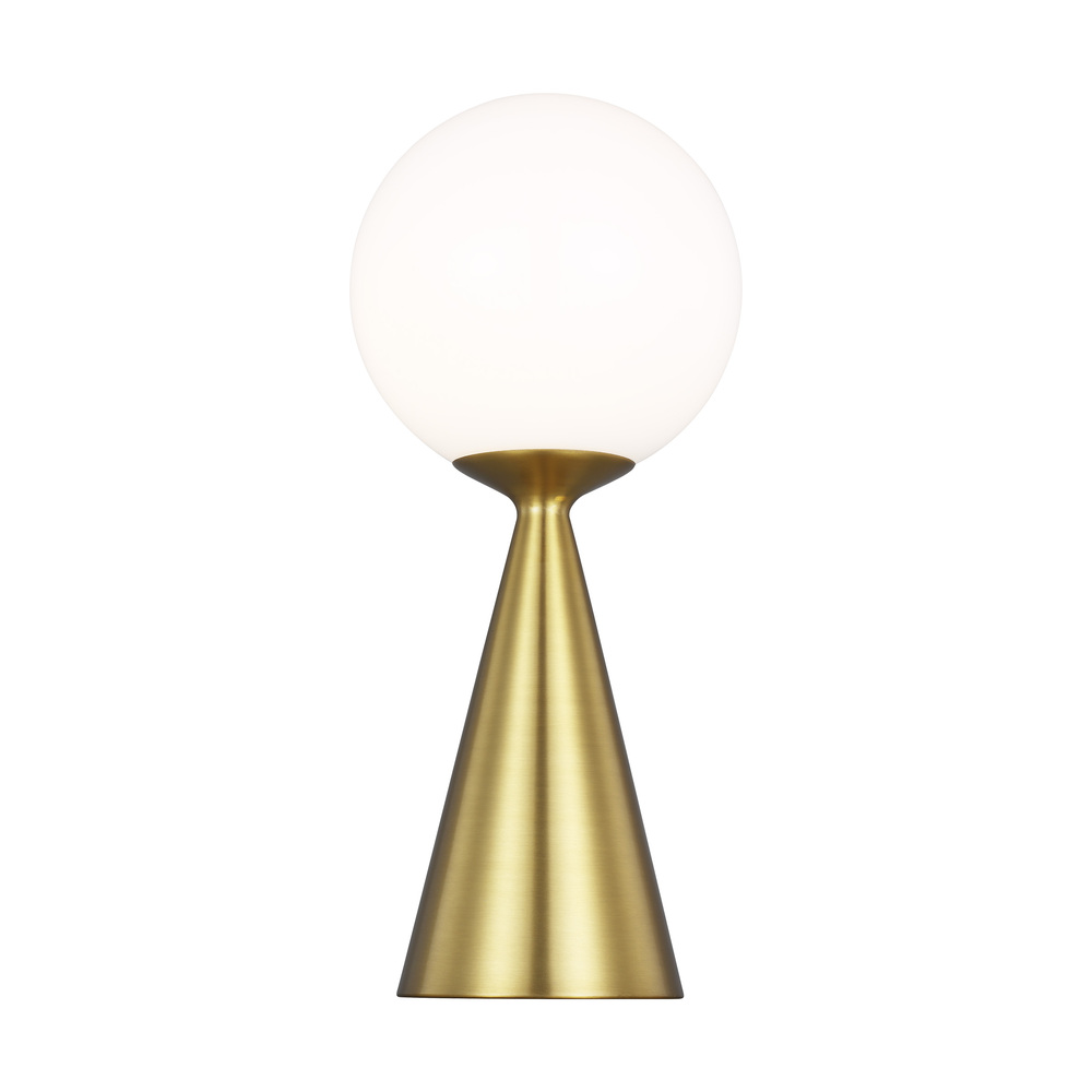 The Galassia one light table lamp by AERIN in burnished brass is originally inspired by kinetic sculpture, the Galassia Table Lamp perfectly balances a glass globe atop a smooth, conical base, giving it a contemporary look. The white glass casts a soft, welcoming glow over a space. This versatile piece adds an artistic touch to a desk or side table